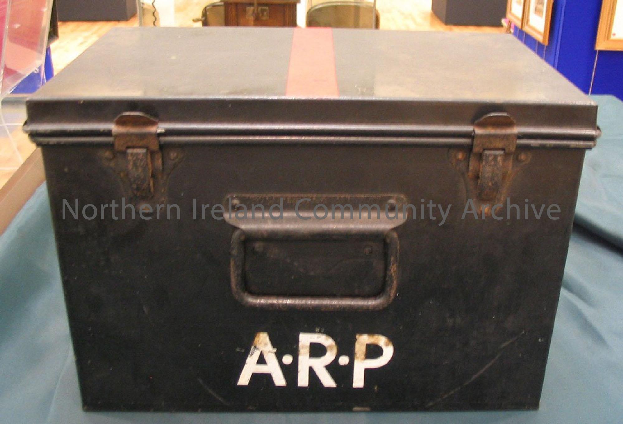 Air raid precaution equipment box. Box with hinged lid on top, coloured black with a red stripe on the lid and ARP written on side.
