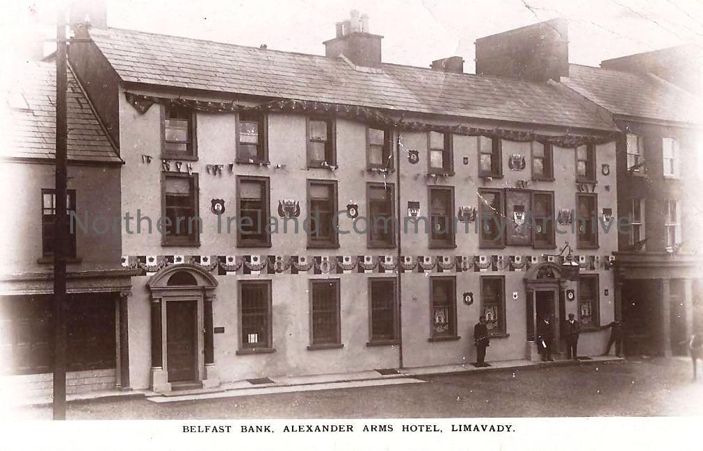 Postcard titled, 'Belfast Bank, Alexander Arms Hotel, Limavady' (LVADY1997.13)
