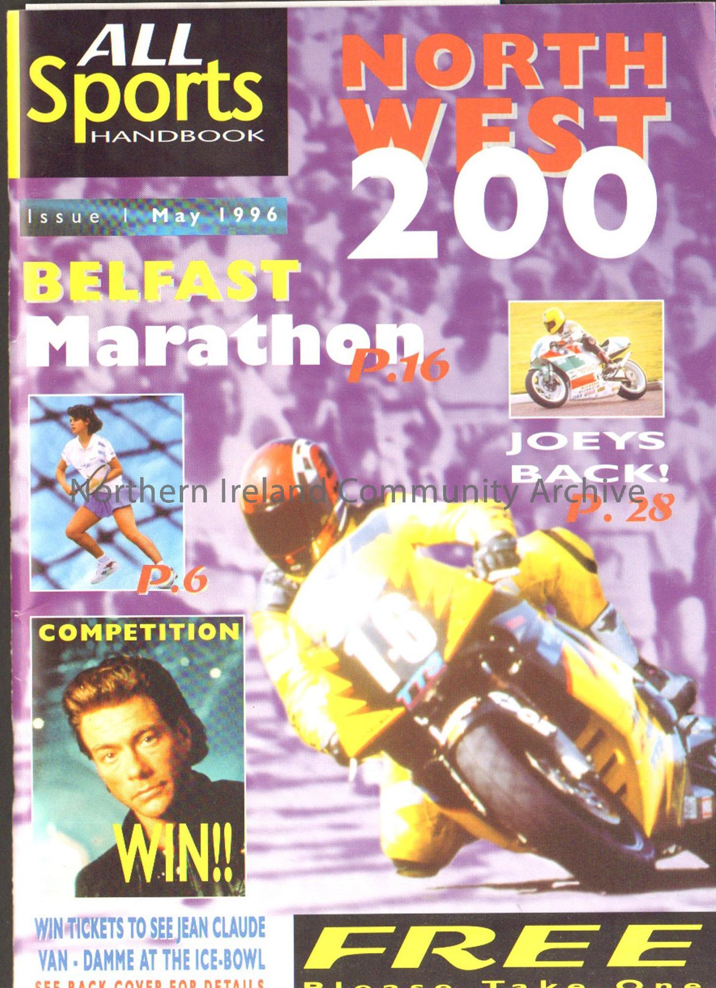 All Sports Handbook, Issue 1, May 1996. Features on cover large image of Joey Dunlop racing, a woman playing tennis and Jean Claude Van Damme.