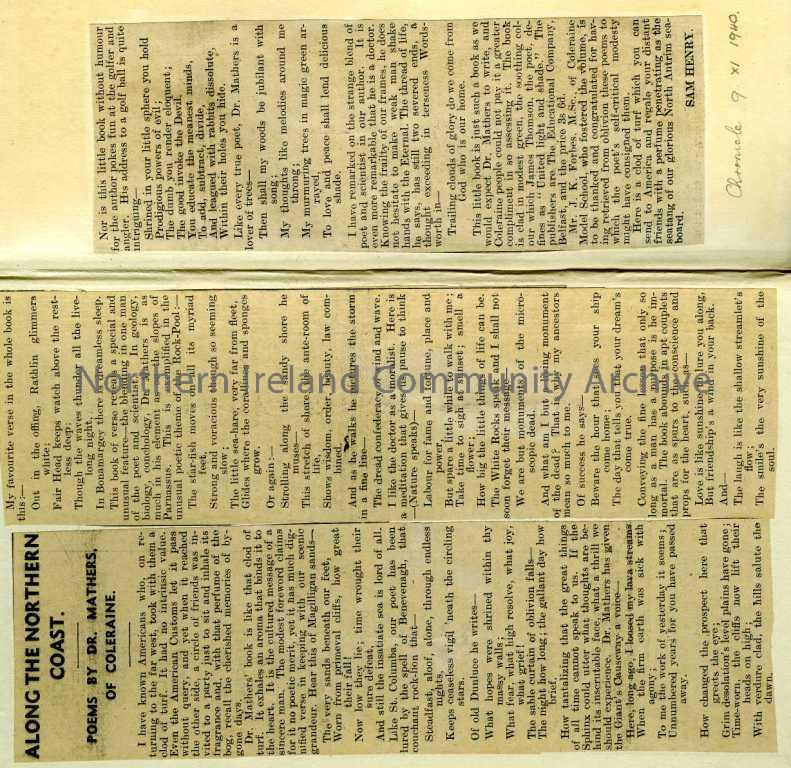 Book of poems, many of them relating to the Causeway area. Extract from 1940 Chronicle, glued to inside cover, re Mathers and Northern Coast poems