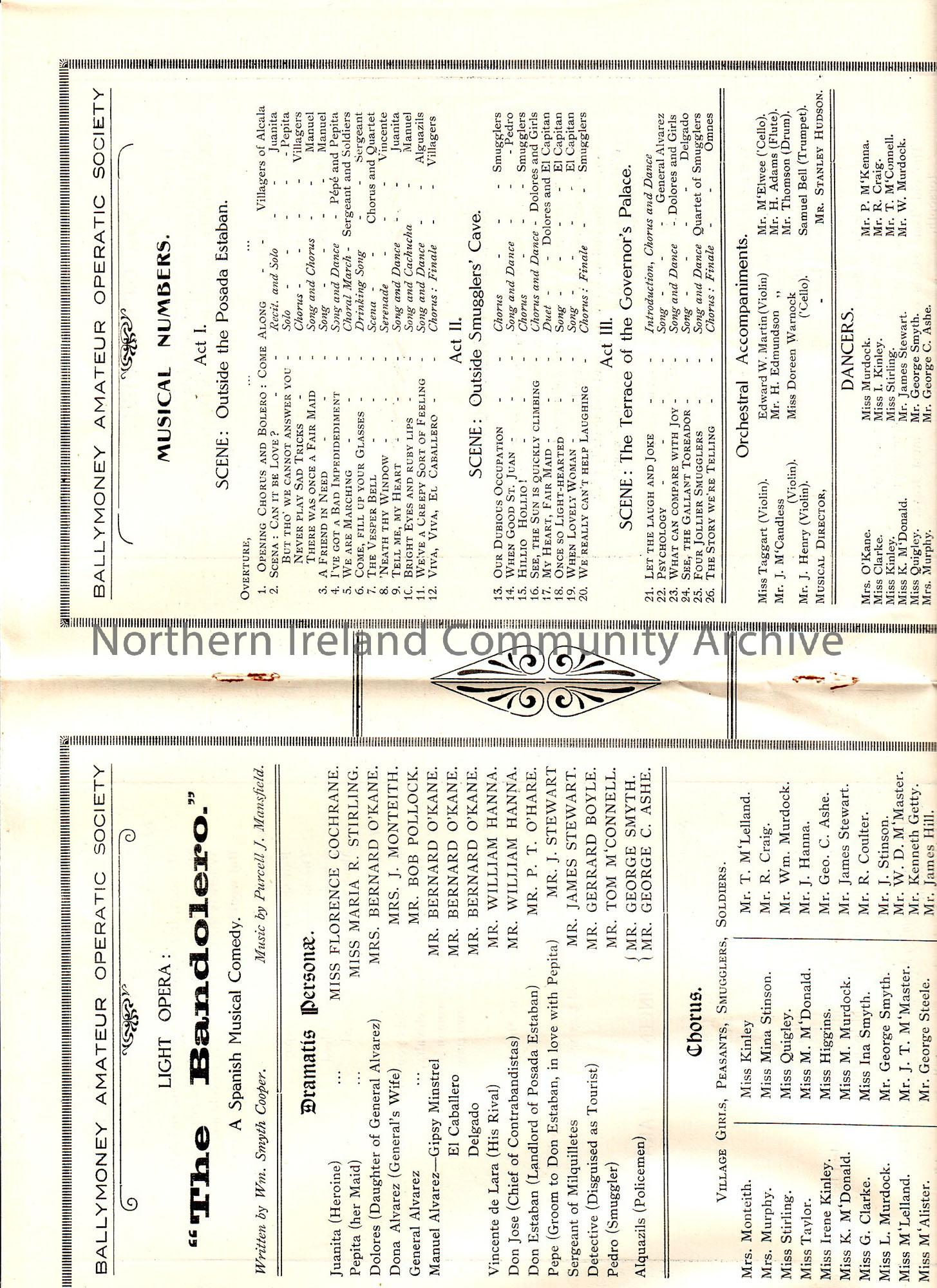Amateur operatic society protestant Hall, Ballymena. Hon,Sec, and Manager, Mr James Hanna programme. March 20th, 1928. Light Opera: “The Bandolero” A …
