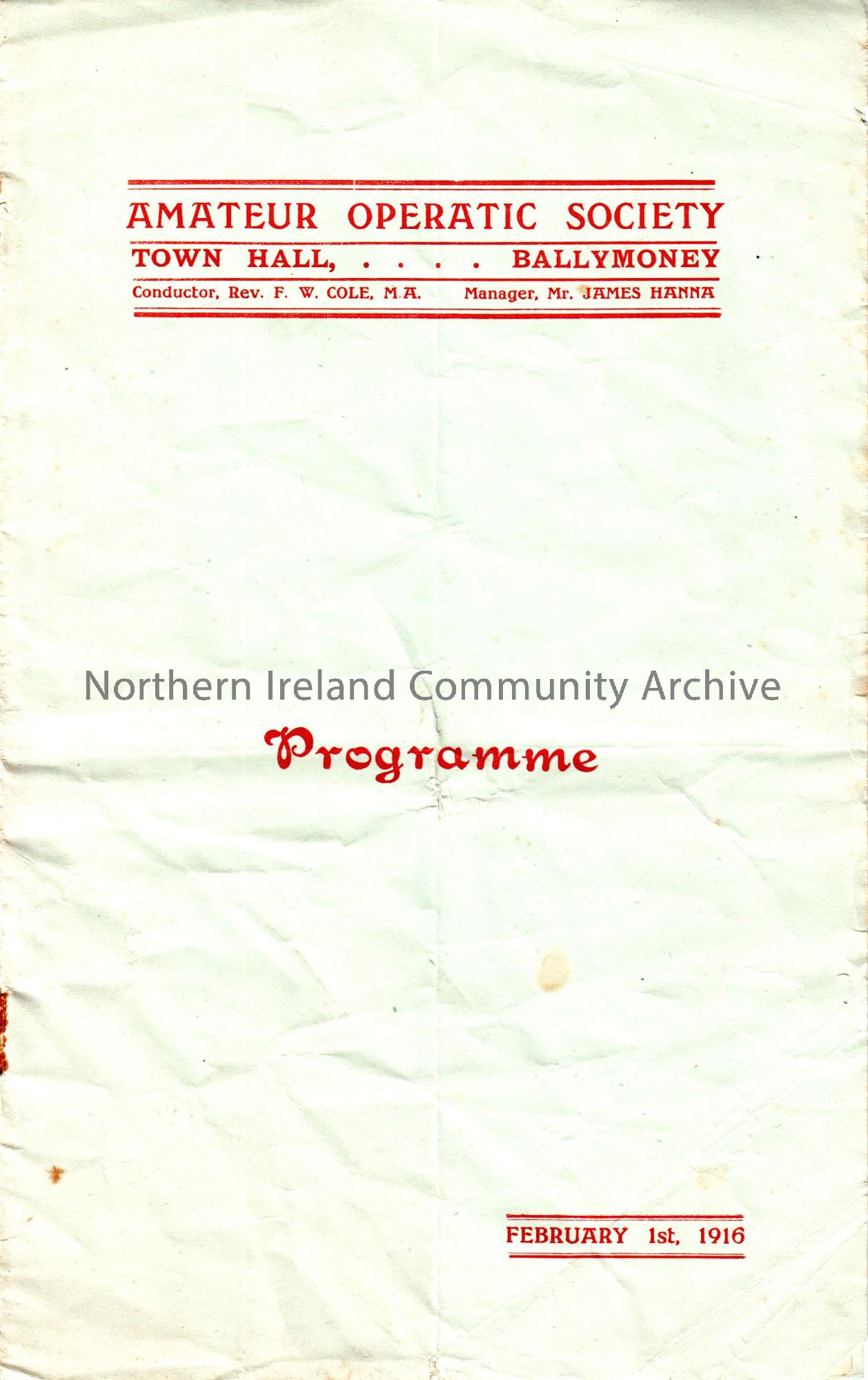 Amateur Operatic Society, Town Hall, Ballymoney, February 1st, 1916