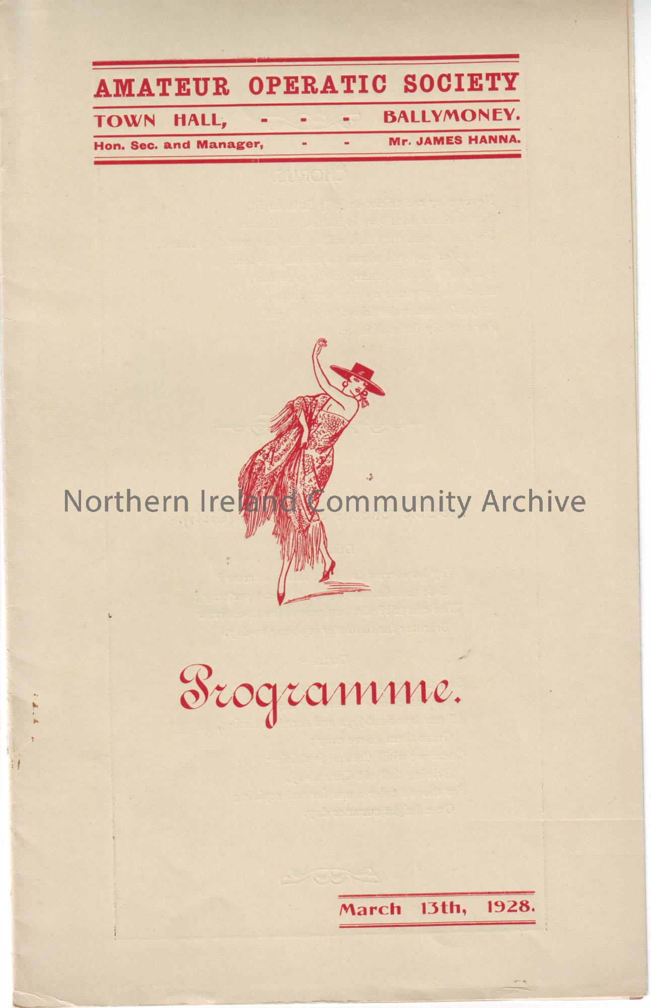 Amateur Operatic Society Town Hall, Ballymoney. hon, sec and manager Mr James Hanna. march 13th, 1928. The Bandolero