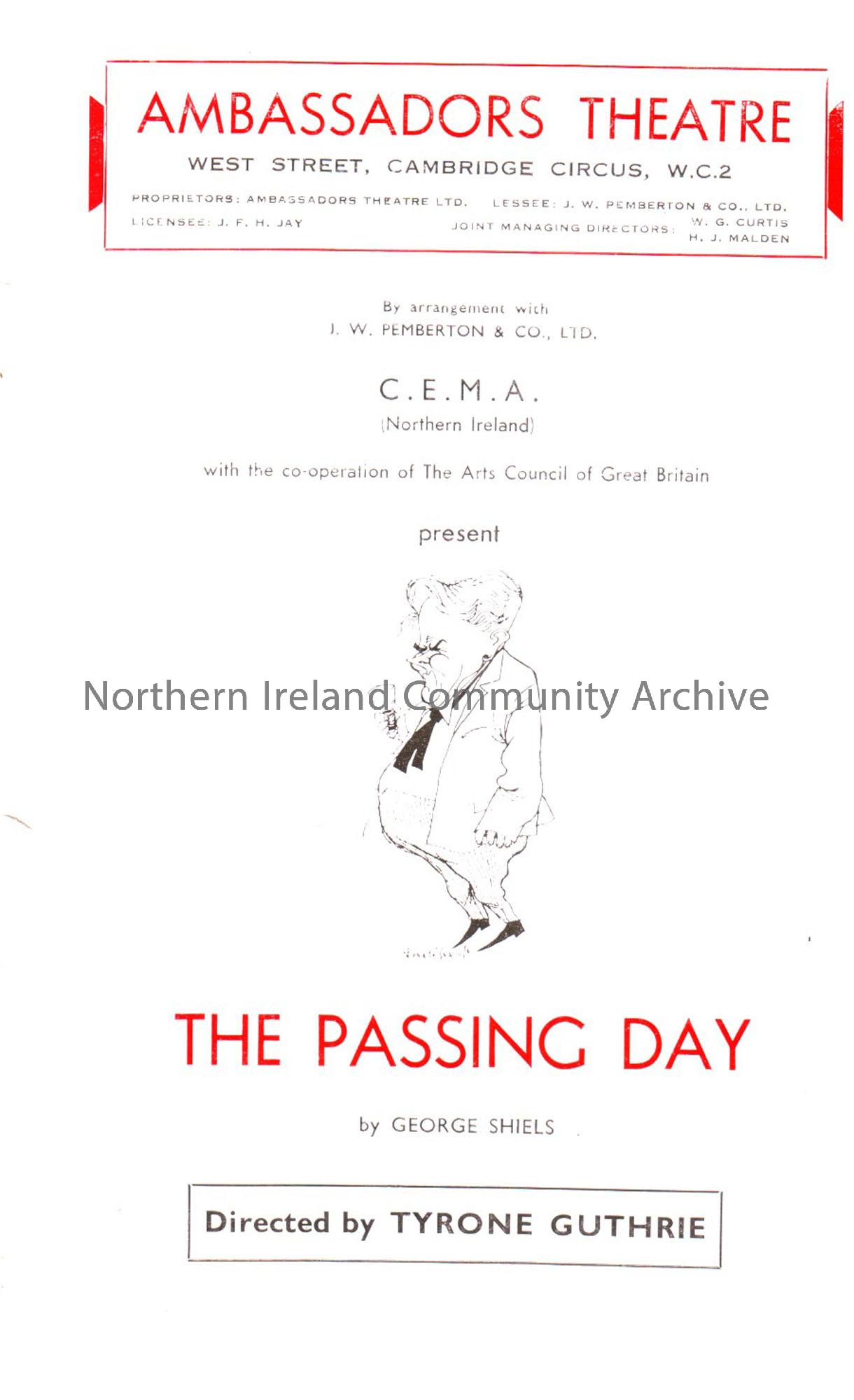 Ambassadors Theatre, West Street, Cambridge Circus. C.E.M.A (Northern Ireland) present ‘The Passing Day’ by George Shiels. Directed by Tyrone Guthrie