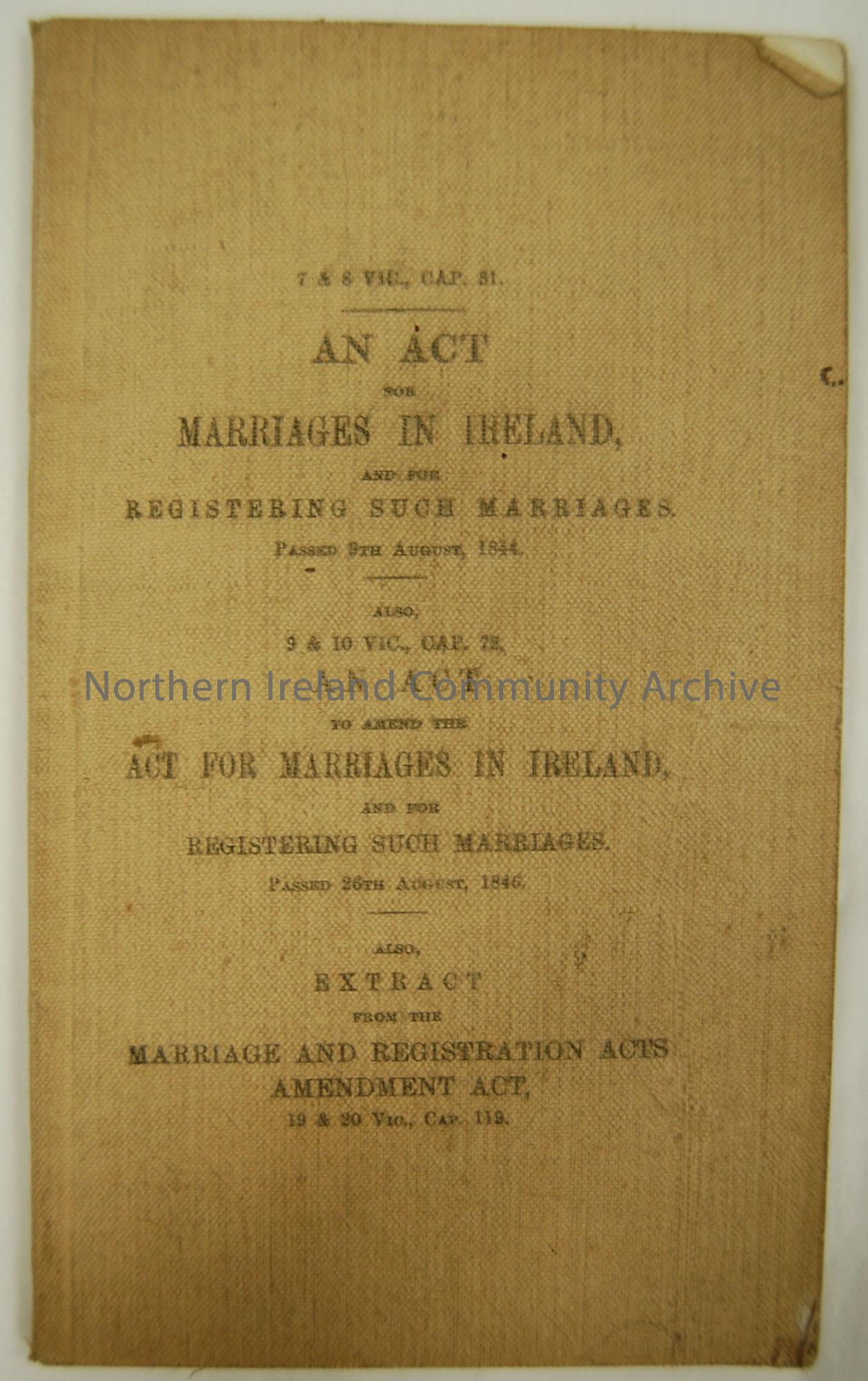 An act for marriages in Ireland, and for Registering such marriages. Passed 9th August, 1844. Also an act to amend the act for marriages in Ireland, and for registering such marriages, 26th August, 1846.
