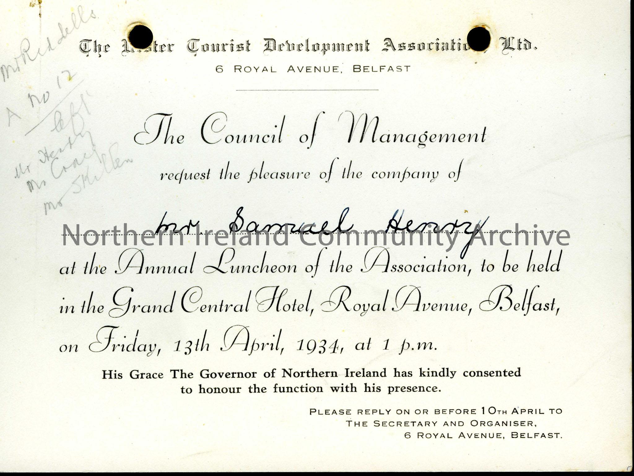 An invitation card to a luncheon in Belfast on 13th April, 1934 from the Ulster Tourist Development Association Ltd.