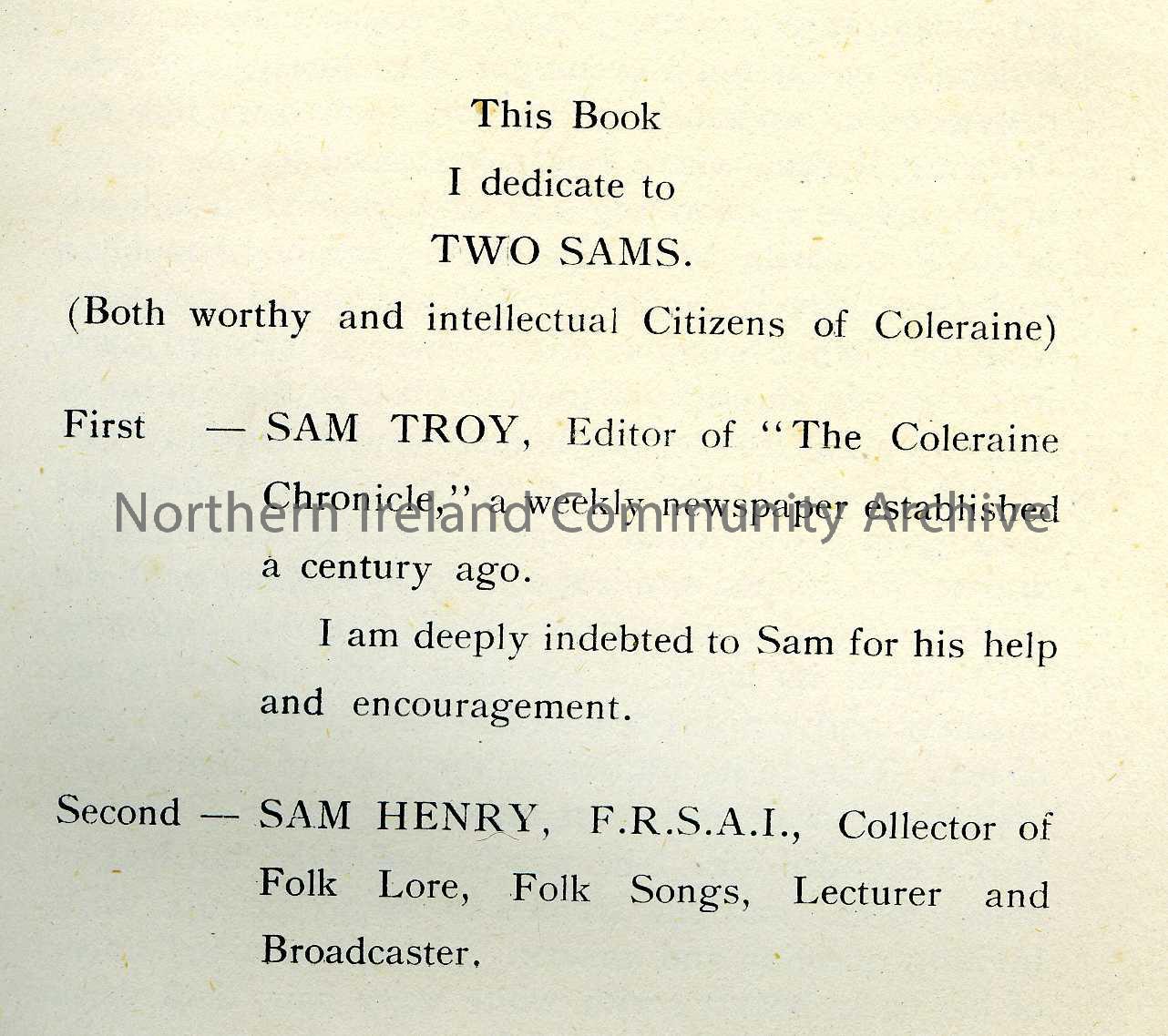 An Irish Girl's Obsession - a fictional story incorporating real characters from Coleraine. The book is dedicated to Sam Henry and Sam Troy, editor of the Chronicle and descendant of John Troy, bellman, bill poster and one time street scavenger in 1th 1860s to 1890s