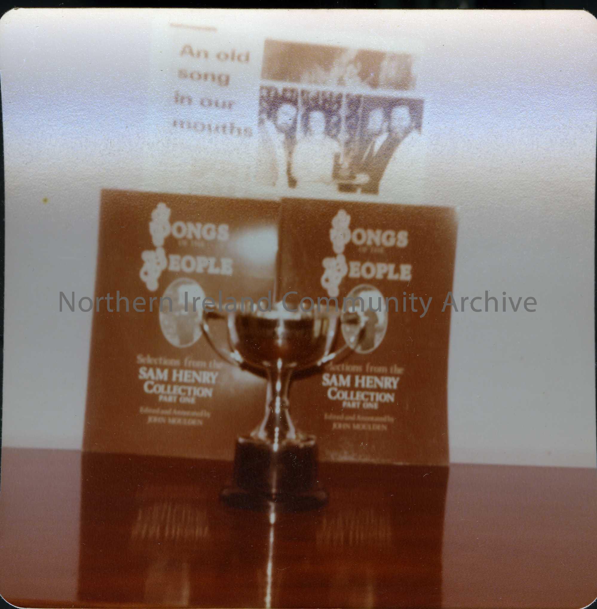 Another photo of a silver cup with John Moulden's book of the Sam Henry Collection, "Songs of the People" in the background. There is a newspaper cutting about the book launch also.
