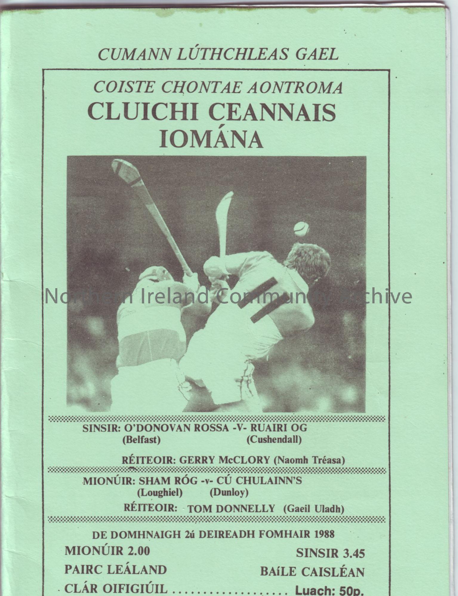 Antrim County Hurling Final O’Donovan Rossa v Ruairi Og and Minor Final Dunloy Cuchullains v Loughgiel Shamrocks at Ballycastle 2nd Oct 1988