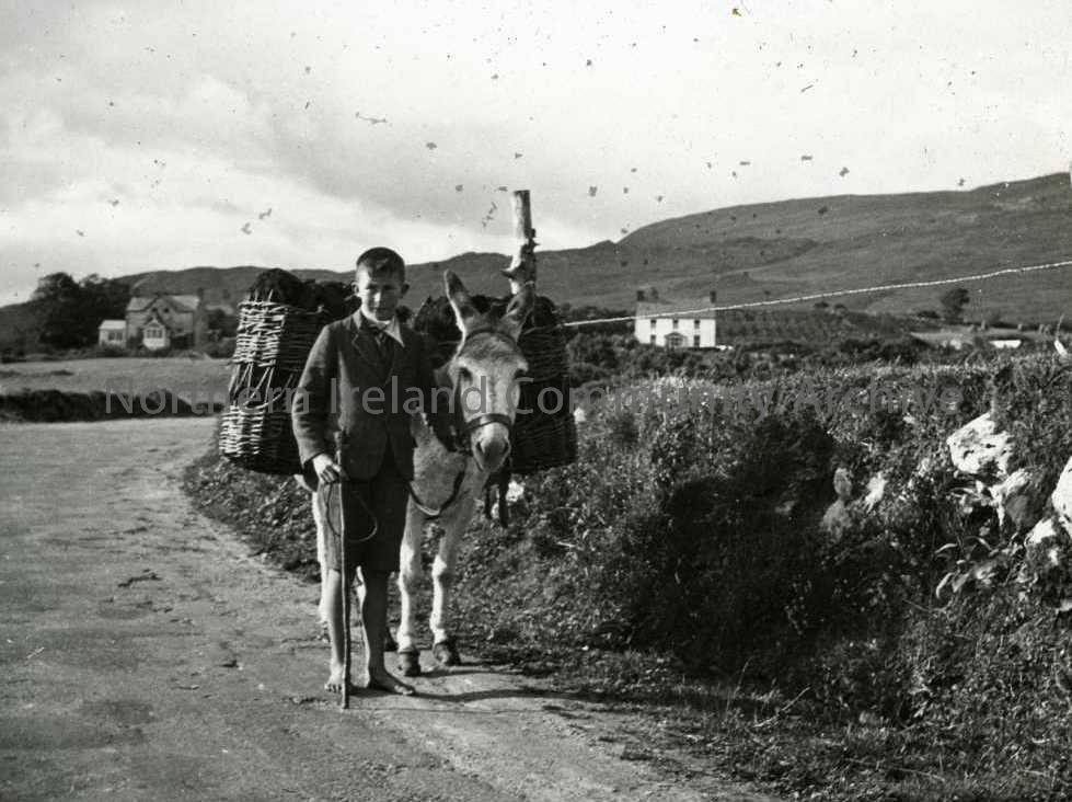 Barefoot boy leading donkey, with turf-laden panniers, along country road