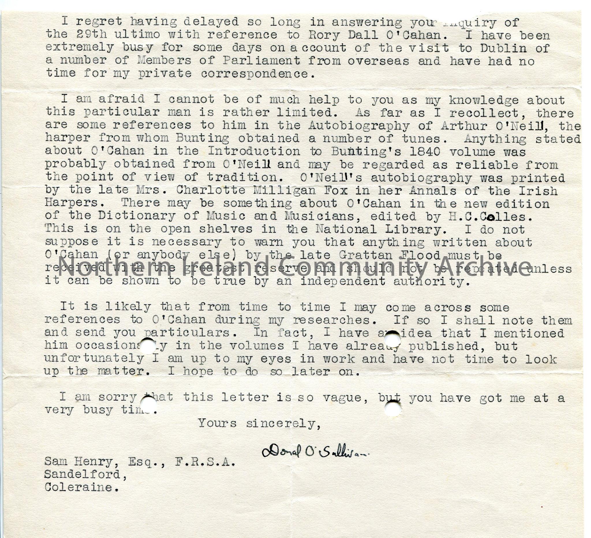 Appears to be end of letter from Donal O’Sullivan, re information on Rory Dall O’Cahan.