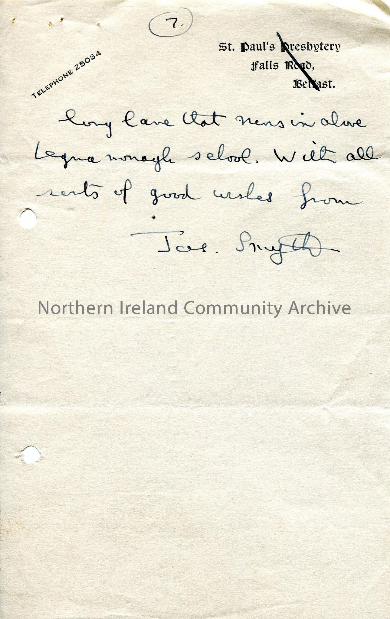Appears to be last page of handwritten letter – number 7 written at top. On headed notepaper of St Paul’s Presbytery, Falls Road, Belfast – line drawn…
