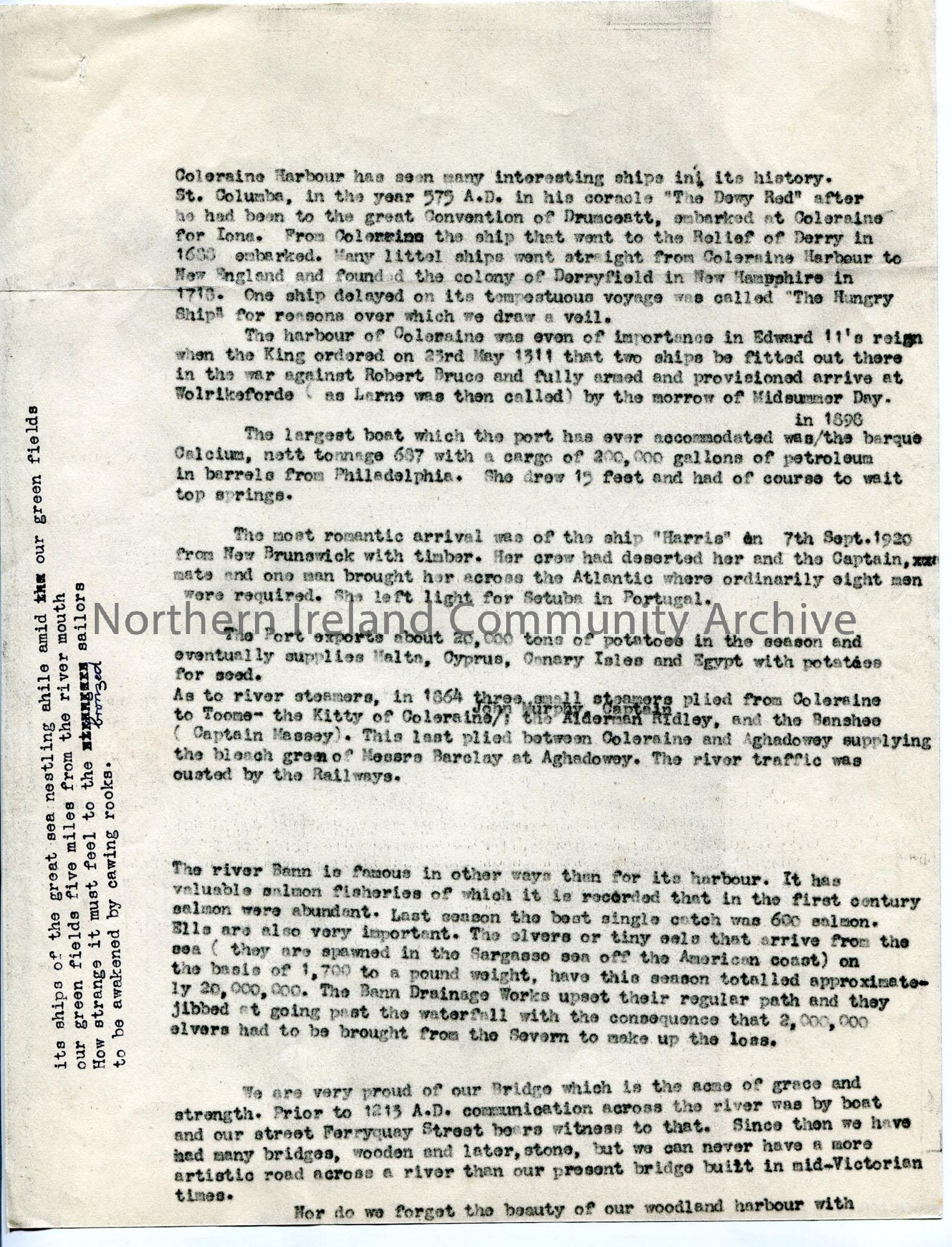 Appears to be part of the script for the ‘Provincial Journey’ programme broadcast from Coleraine Town Hall. Relates to Coleraine harbour – history and…