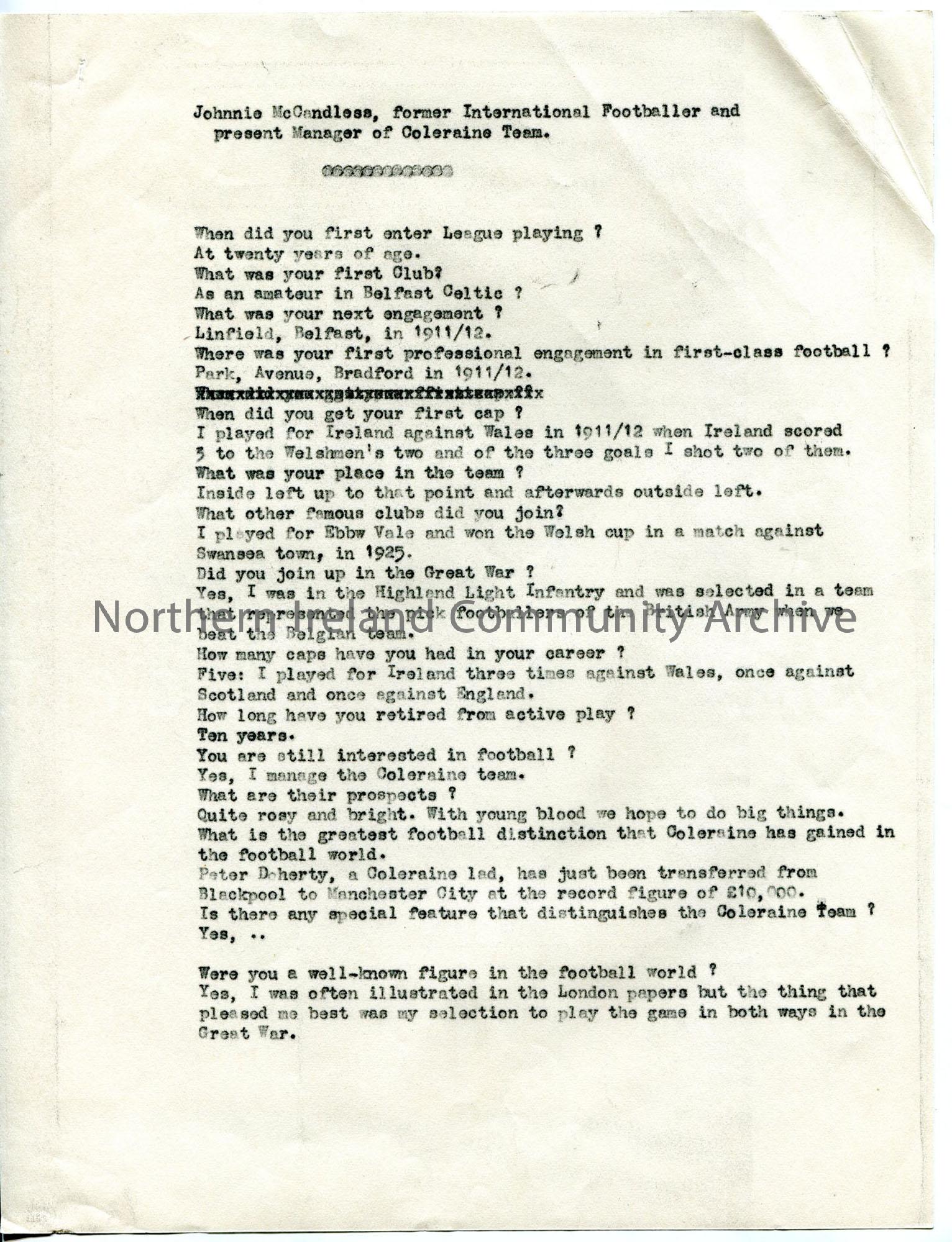 Appears to be part of the script for the 'Provincial Journey' programme broadcast from Coleraine Town Hall. Script for interview with Johnnie McCandless - international footballer and manager of Coleraine Football team