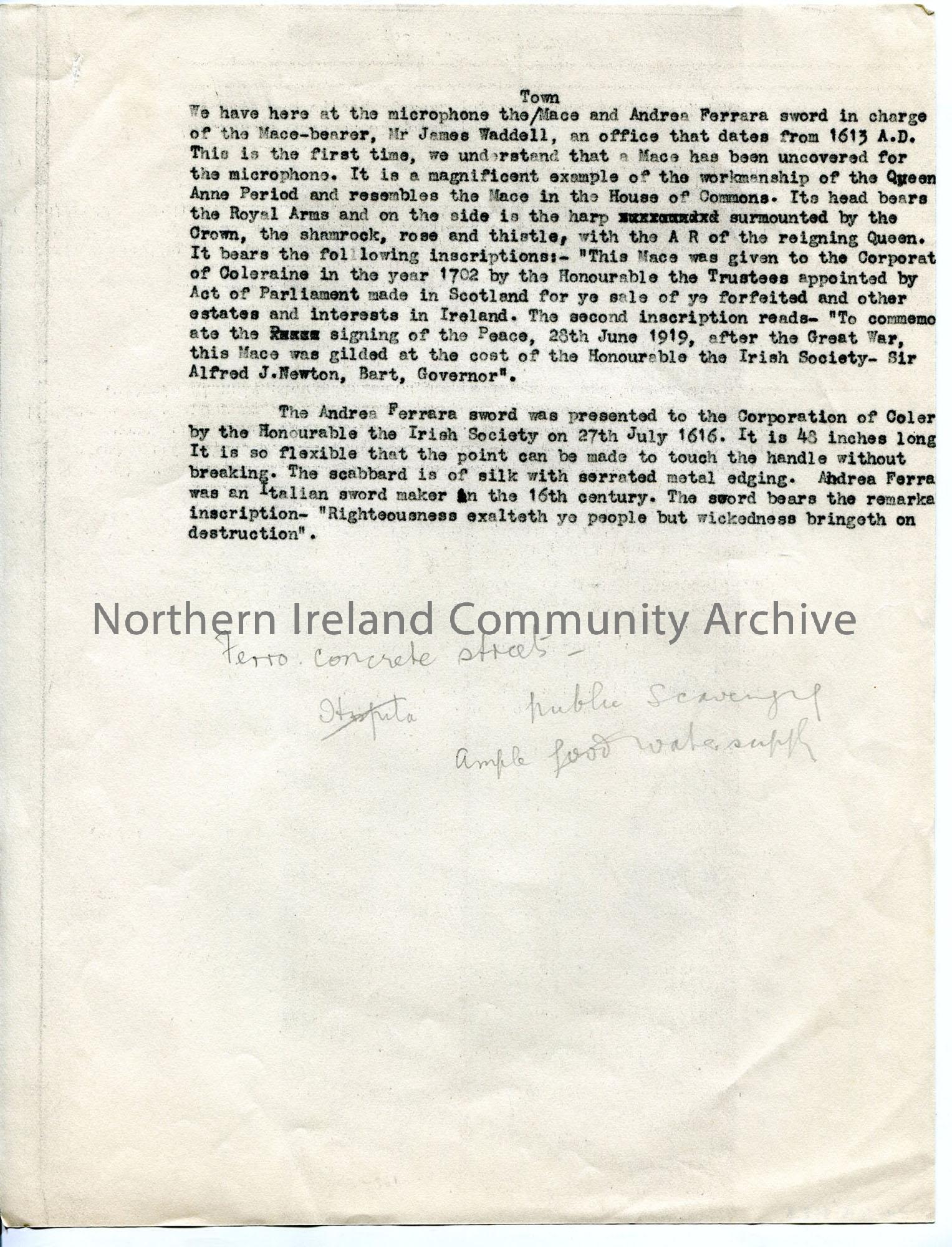 Appears to be part of the script for the ‘Provincial Journey’ programme broadcast from Coleraine Town Hall. The Ferrara sword and the mace and their b…