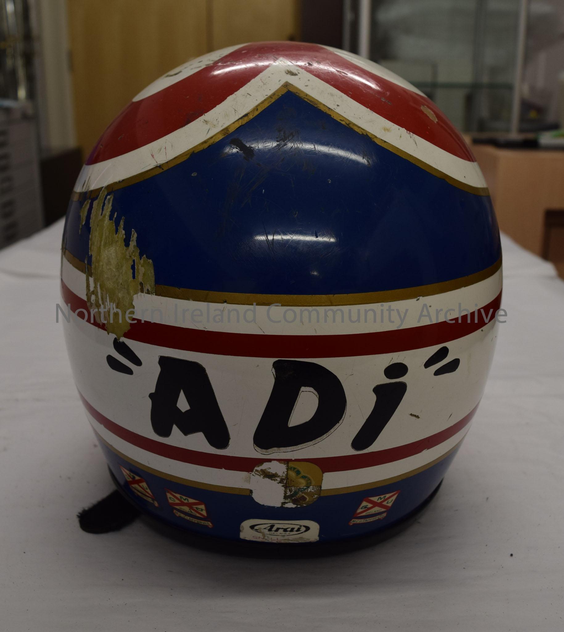 Arai motorcycle helmet belonging to Addie Swan. White helmet with red "m" shaped pattern on top a blue band with gold border around the back and bottom. On the front is the Red Hand of Ulster beneath a crown and in a star.