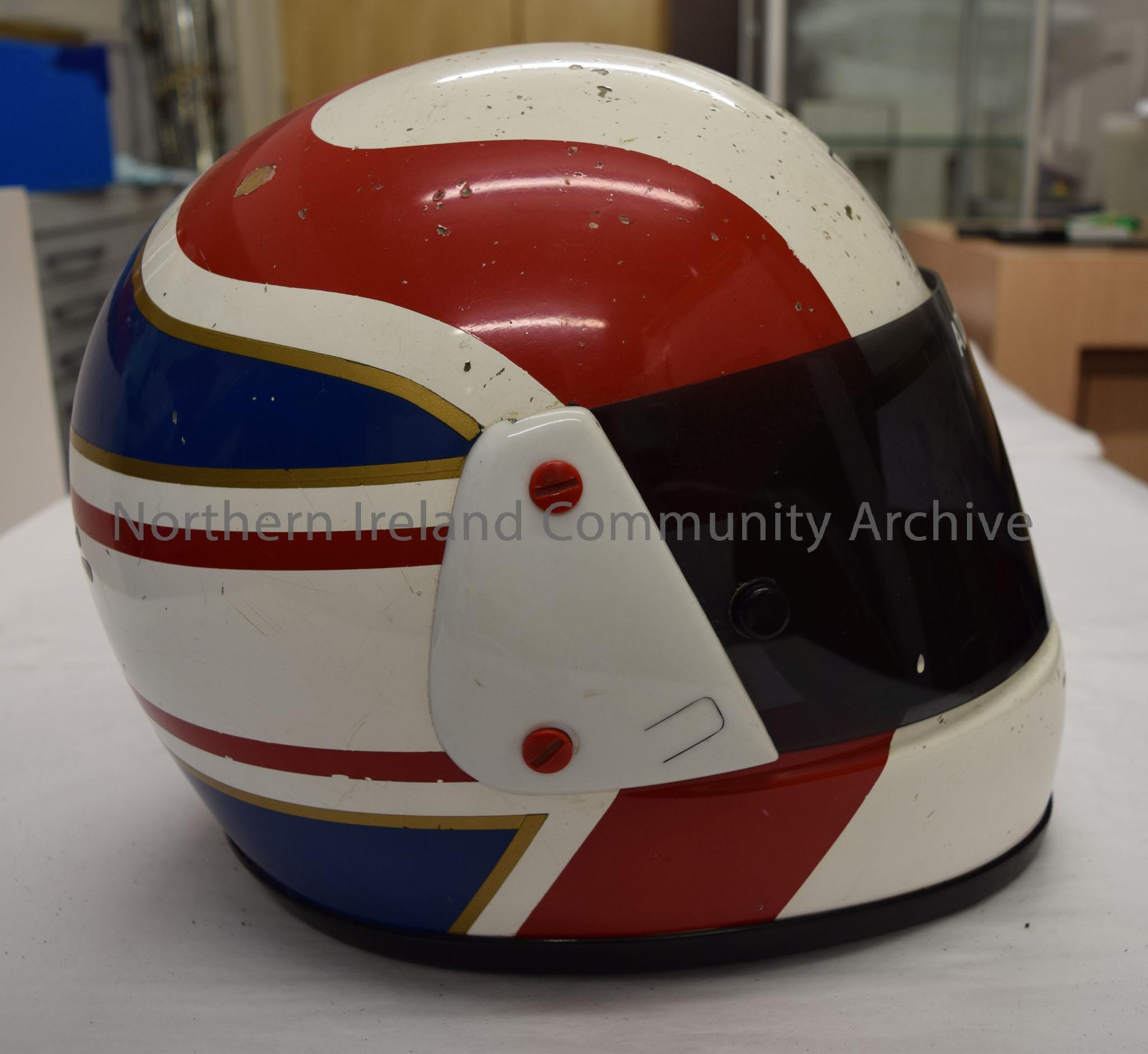 Arai motorcycle helmet belonging to Addie Swan. White helmet with red "m" shaped pattern on top a blue band with gold border around the back and bottom. On the front is the Red Hand of Ulster beneath a crown and in a star.