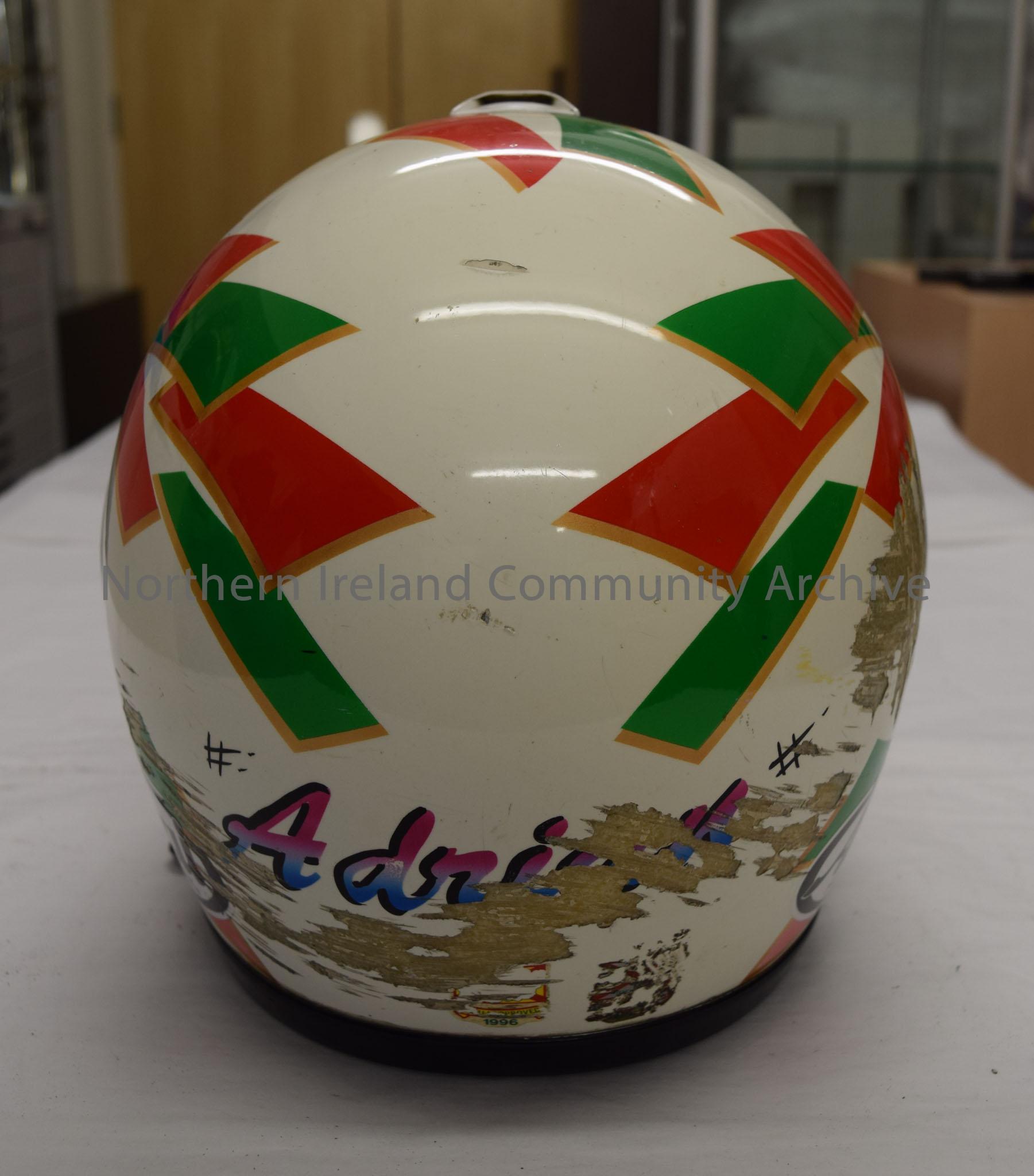 Arai motorcycle helmet belonging to Adrian McFarland. White helmet with red and green trapezium shape pattern with gold borders. – 2016.67 (4)