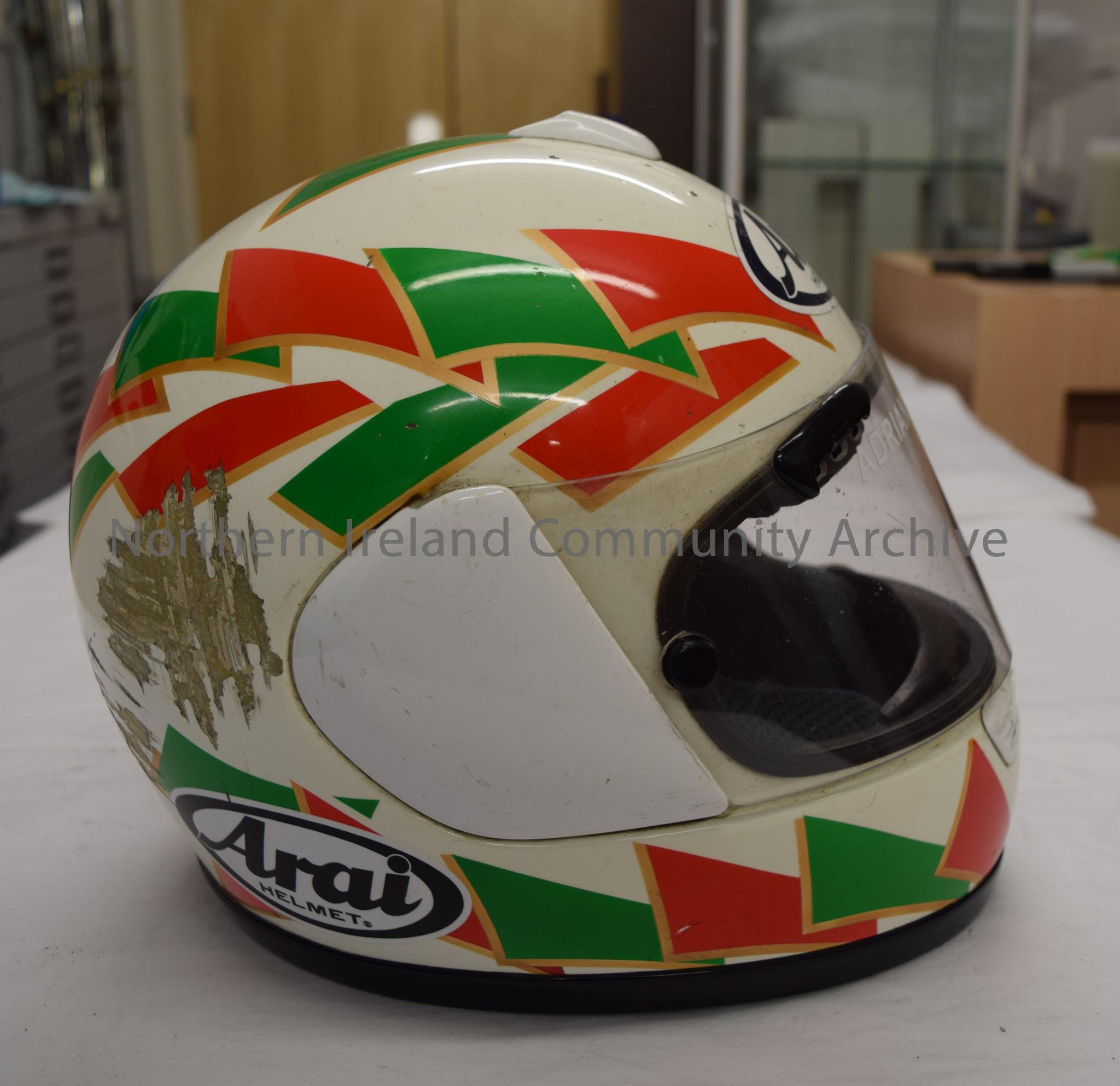 Arai motorcycle helmet belonging to Adrian McFarland. White helmet with red and green trapezium shape pattern with gold borders. – 2016.67 (5)