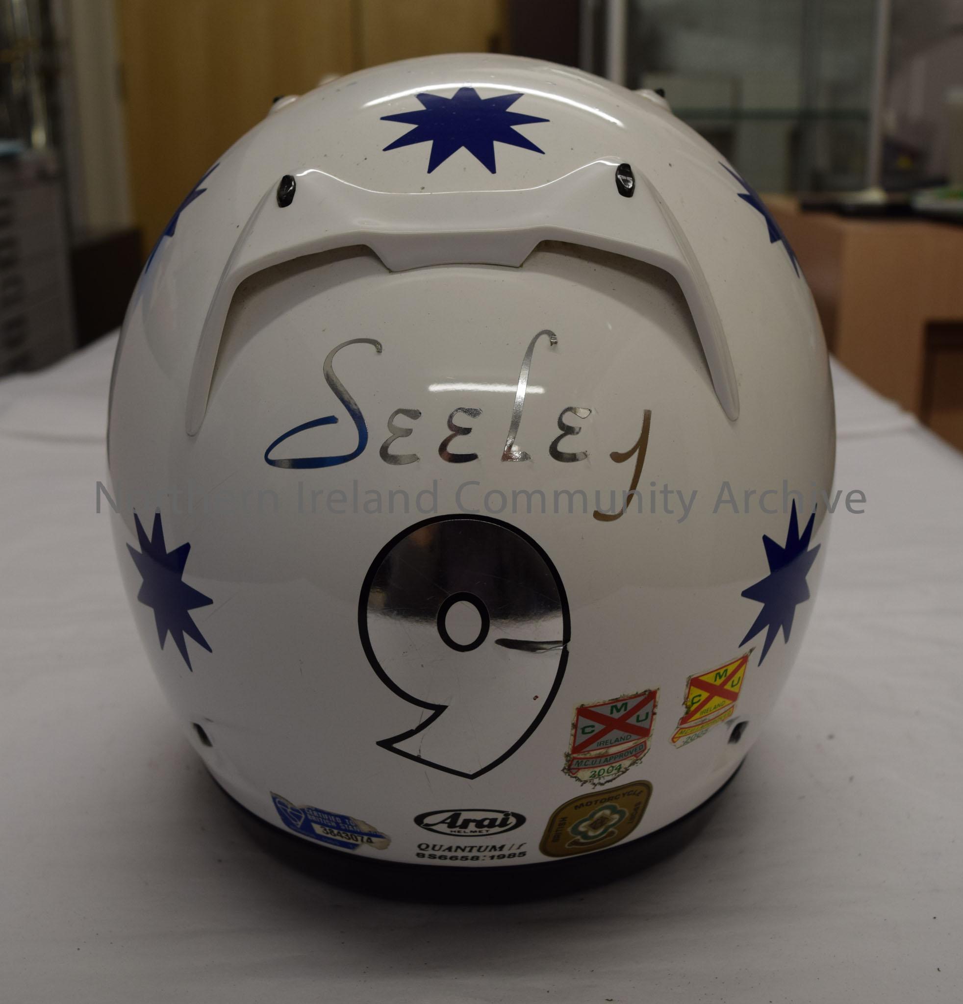 Arai motorcycle helmet belonging to Alastair Seeley. White helmet covered in blue stars. – 2016.91 (4)