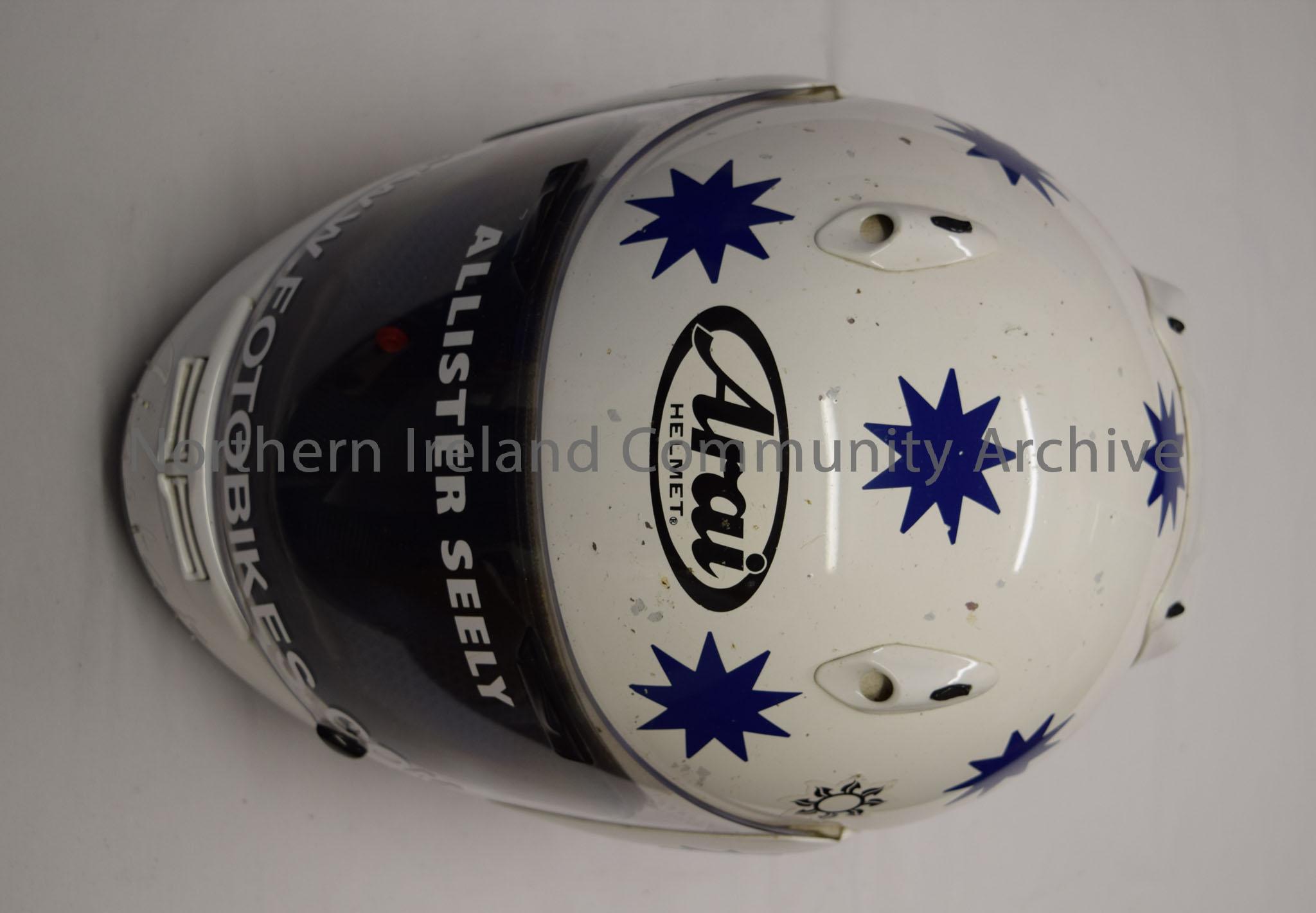 Arai motorcycle helmet belonging to Alastair Seeley. White helmet covered in blue stars.