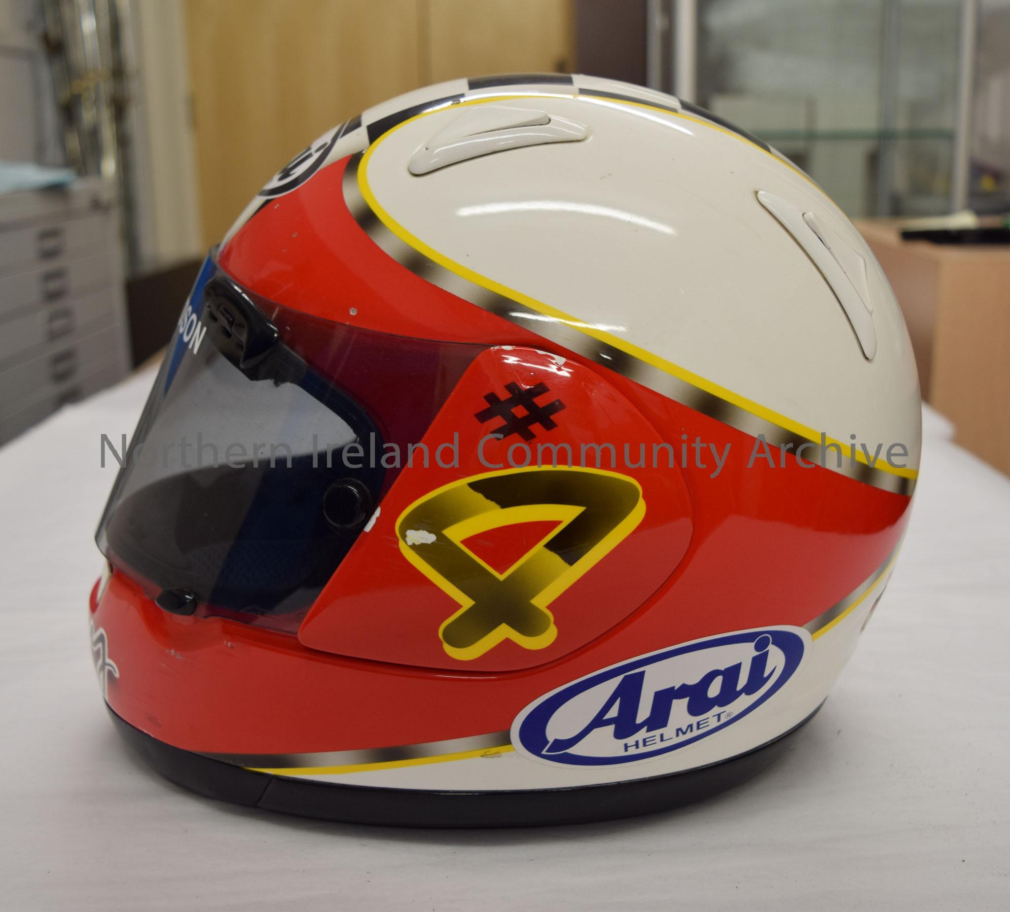 Arai motorcycle helmet belonging to Barry Davidson. Helmet with a red front and base and a white top with yellow and silver trim and a black and white chequered pattern on the top. Barry written on the chin bar and #4 on the visor hinges.