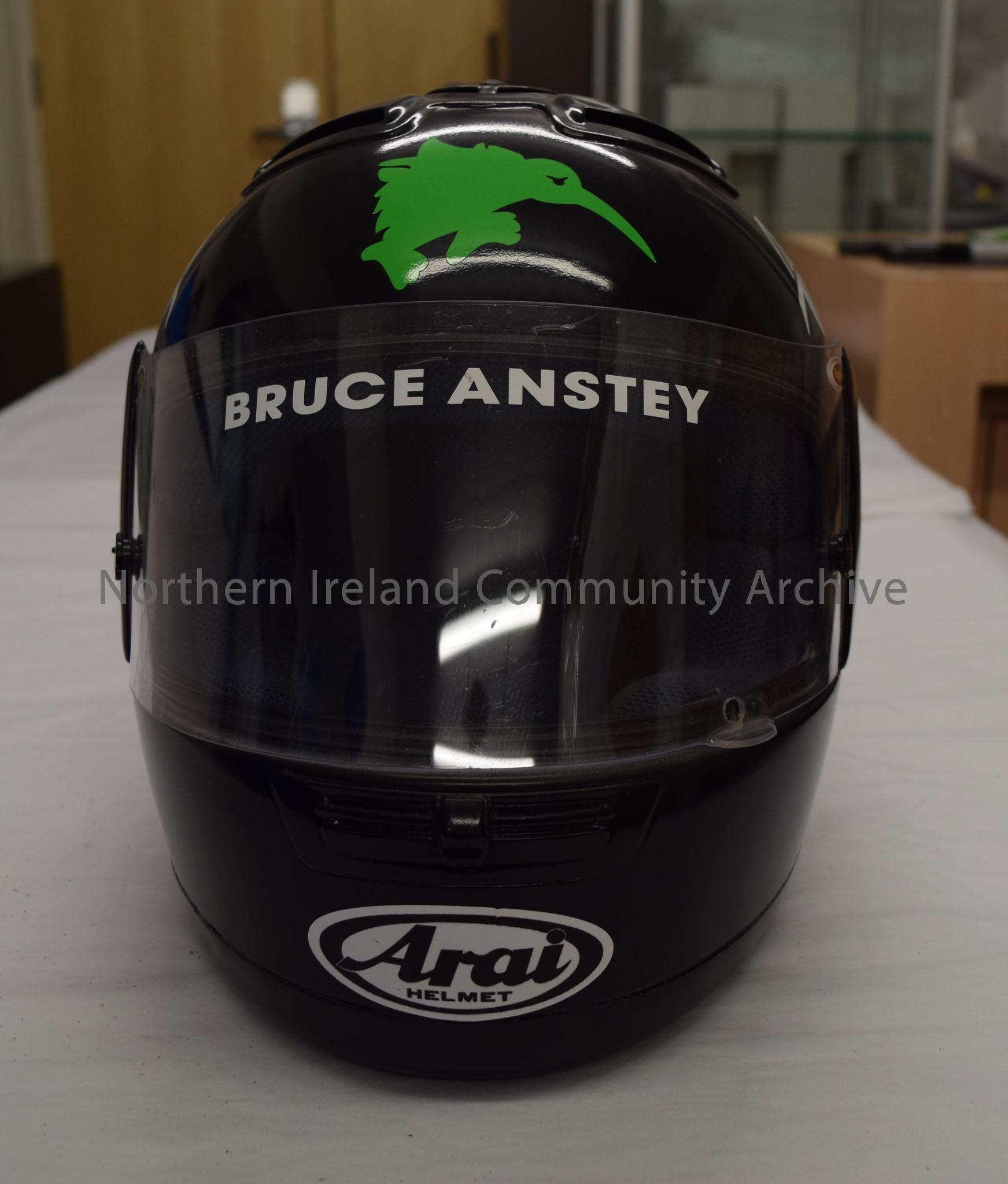 Arai motorcycle helmet belonging to Bruce Anstey. Plain black helmet with an image of a black and white fern leaf on each side and a green silhouette of a kiwi on the front above the visor.