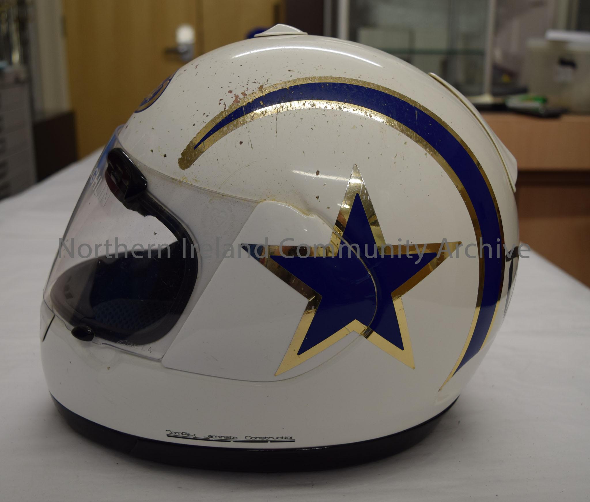 Arai motorcycle helmet belonging to Derek McLaughlin. White with blue and reflective silver stripes down each side and blue and reflective silver stars on each side.
