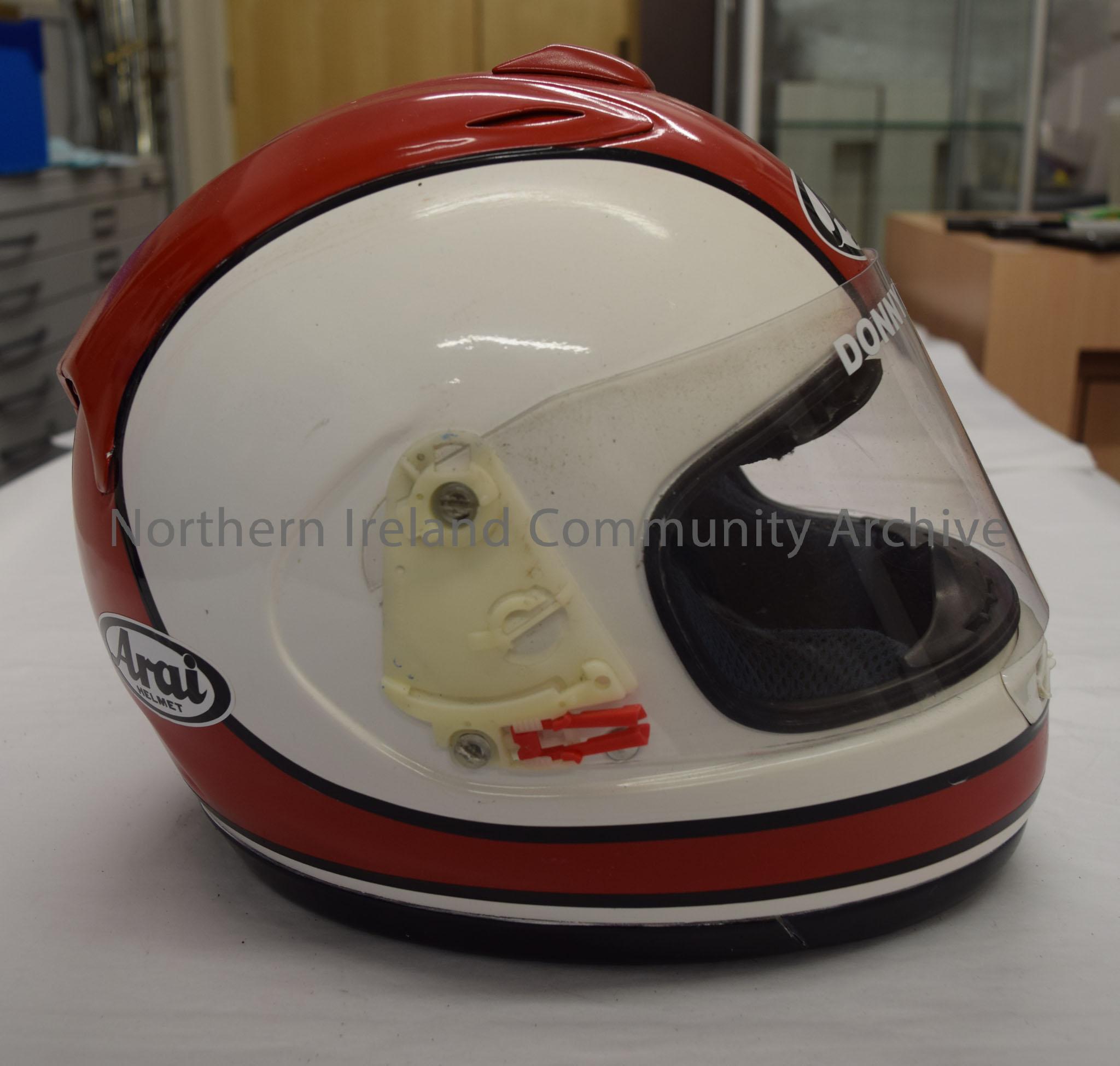 Arai motorcycle helmet belonging to Donny Robinson. White helmet with red stripe with black border running across the top and around the bottom. – 2016.83 (5)
