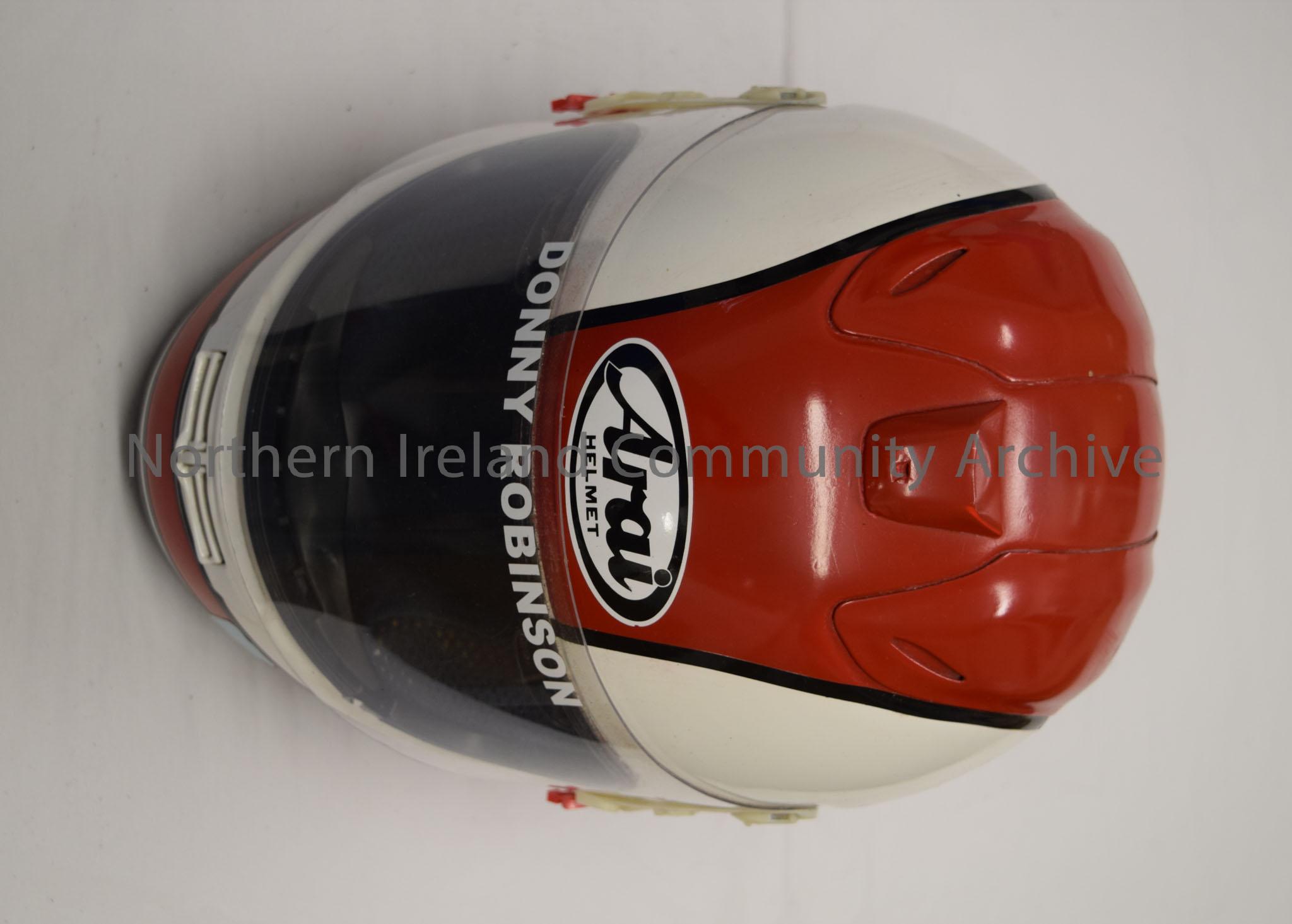 Arai motorcycle helmet belonging to Donny Robinson. White helmet with red stripe with black border running across the top and around the bottom.