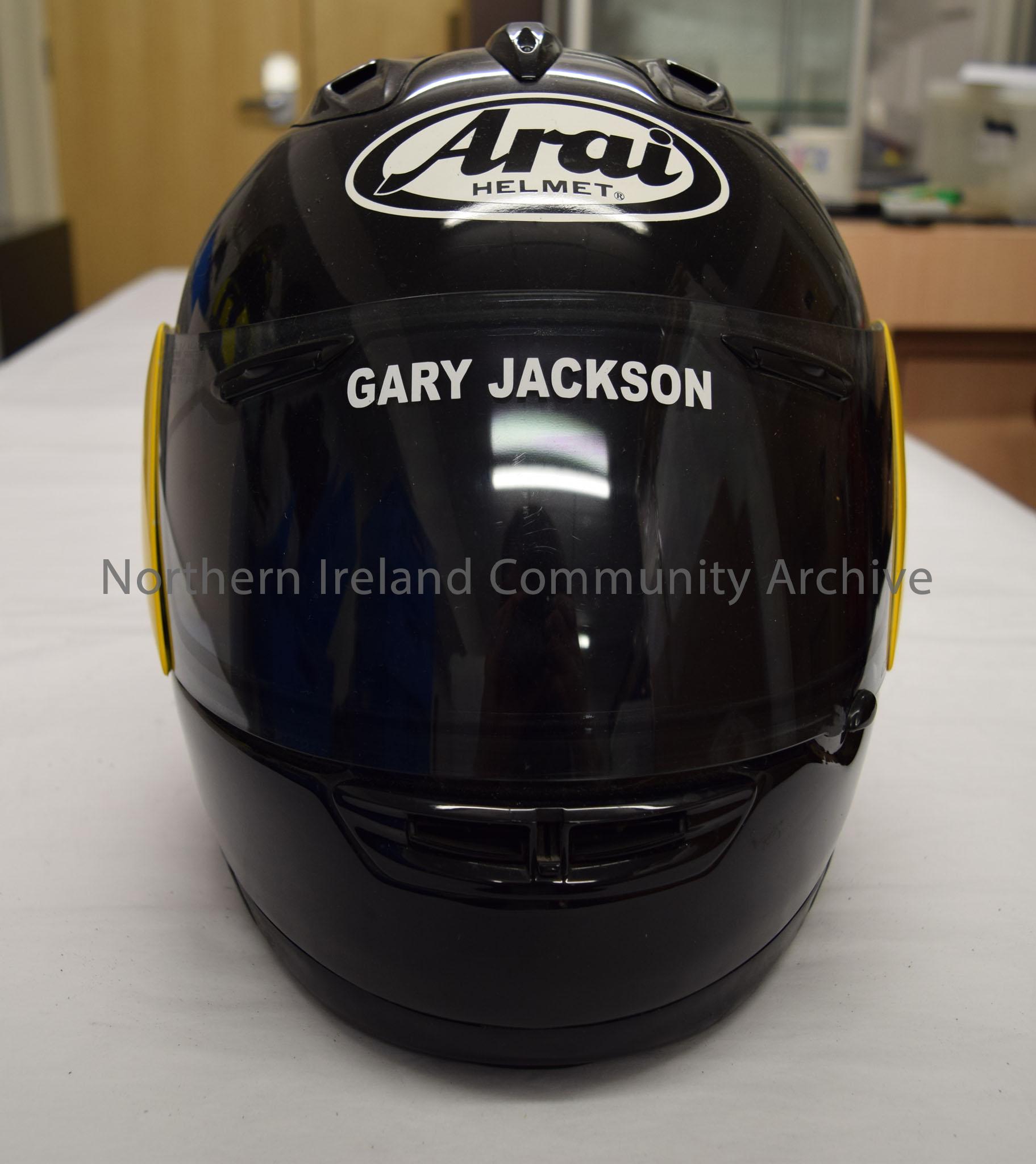Arai motorcycle helmet belonging to Gary Jackson. Black helmet with yellow visor hinge covers.