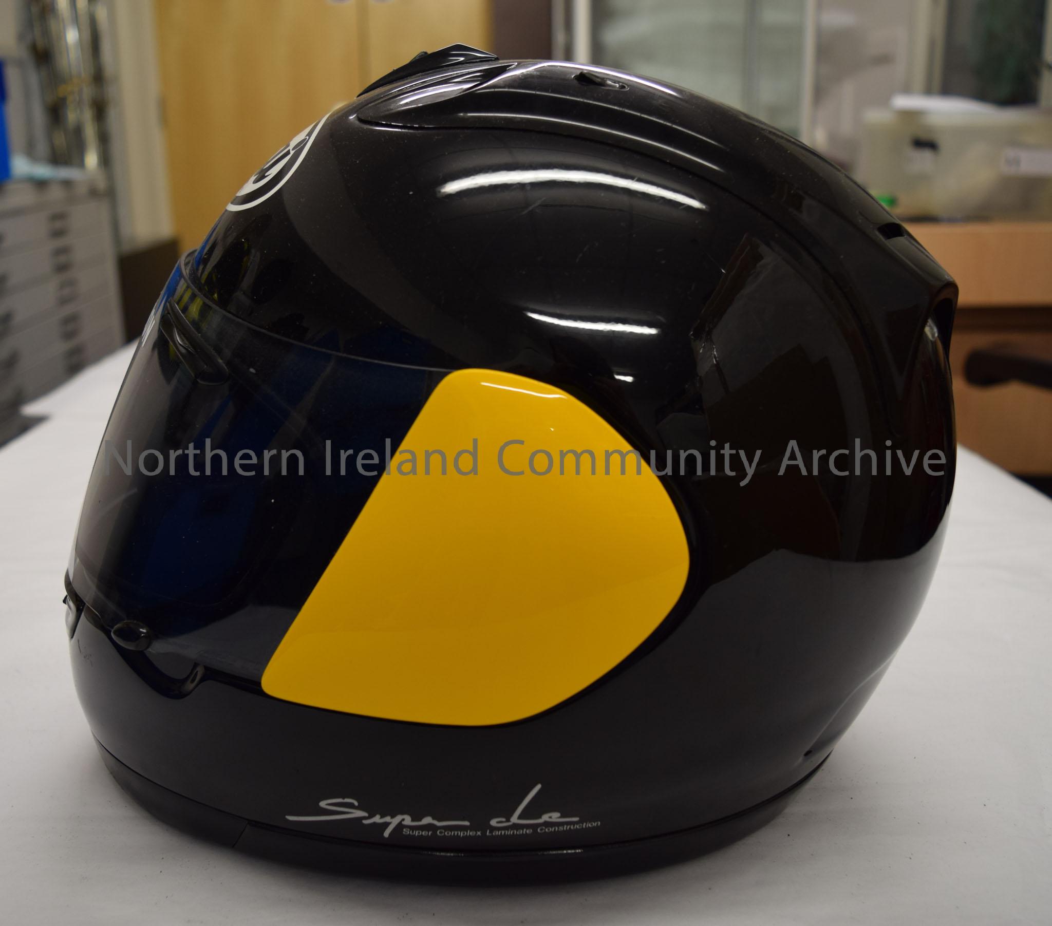 Arai motorcycle helmet belonging to Gary Jackson. Black helmet with yellow visor hinge covers.