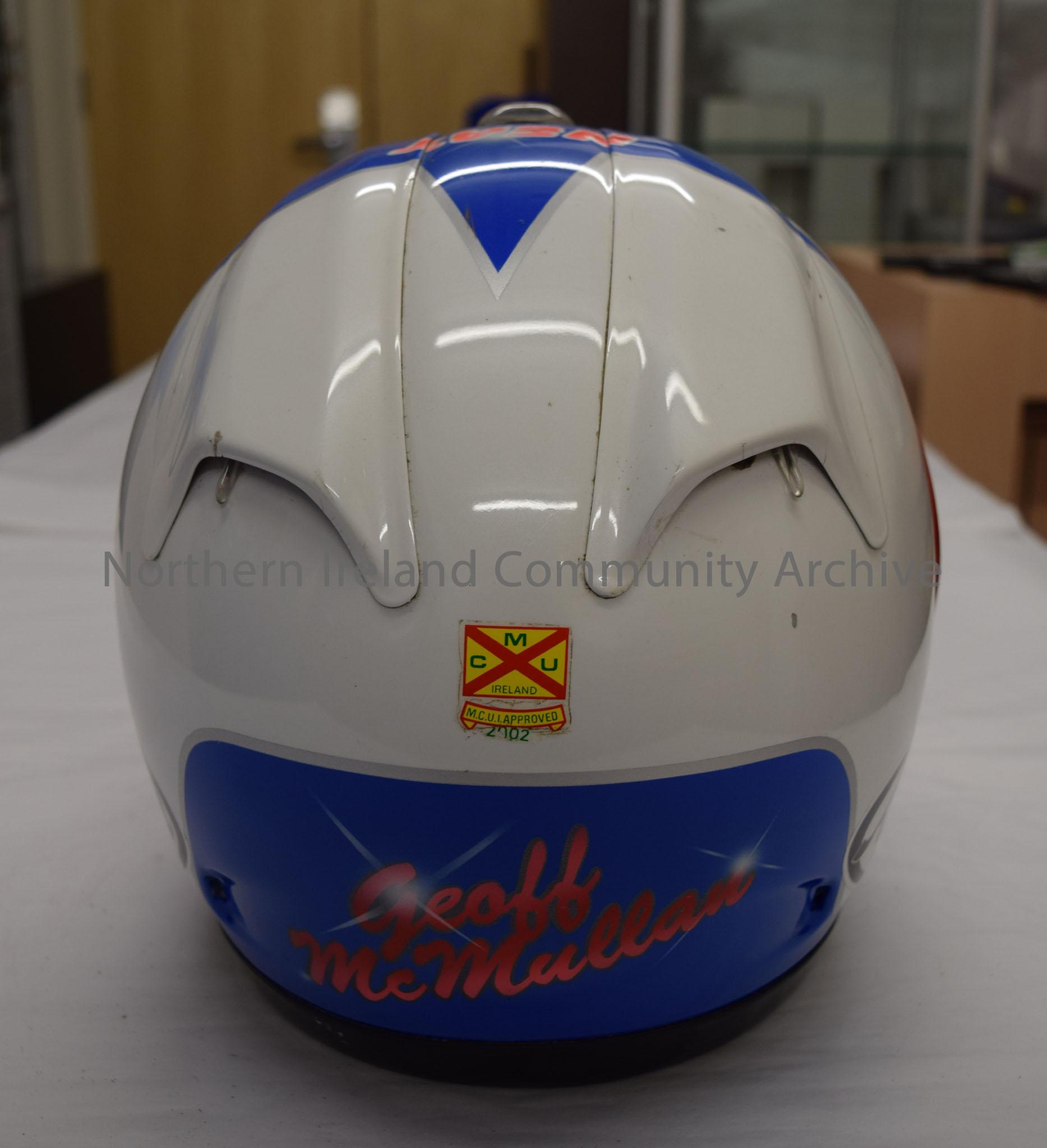 Arai motorcycle helmet belonging to Geoff McMullan. White helmet with red front, blue along the bottom and at the back and a blue star on top. Orange writing.