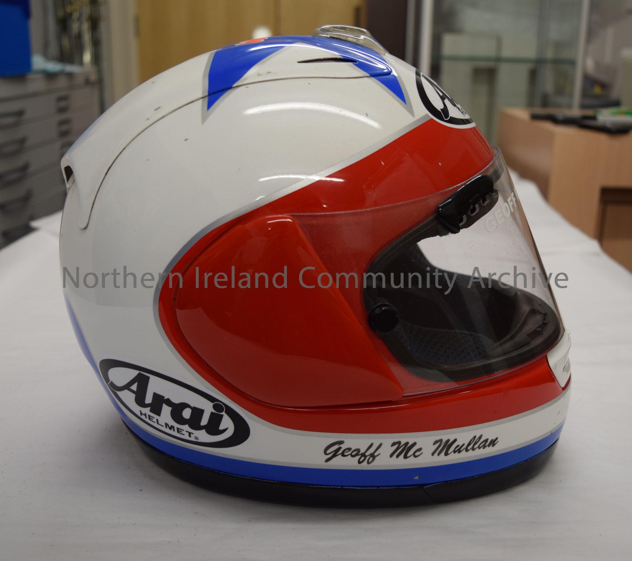 Arai motorcycle helmet belonging to Geoff McMullan. White helmet with red front, blue along the bottom and at the back and a blue star on top. Orange writing.