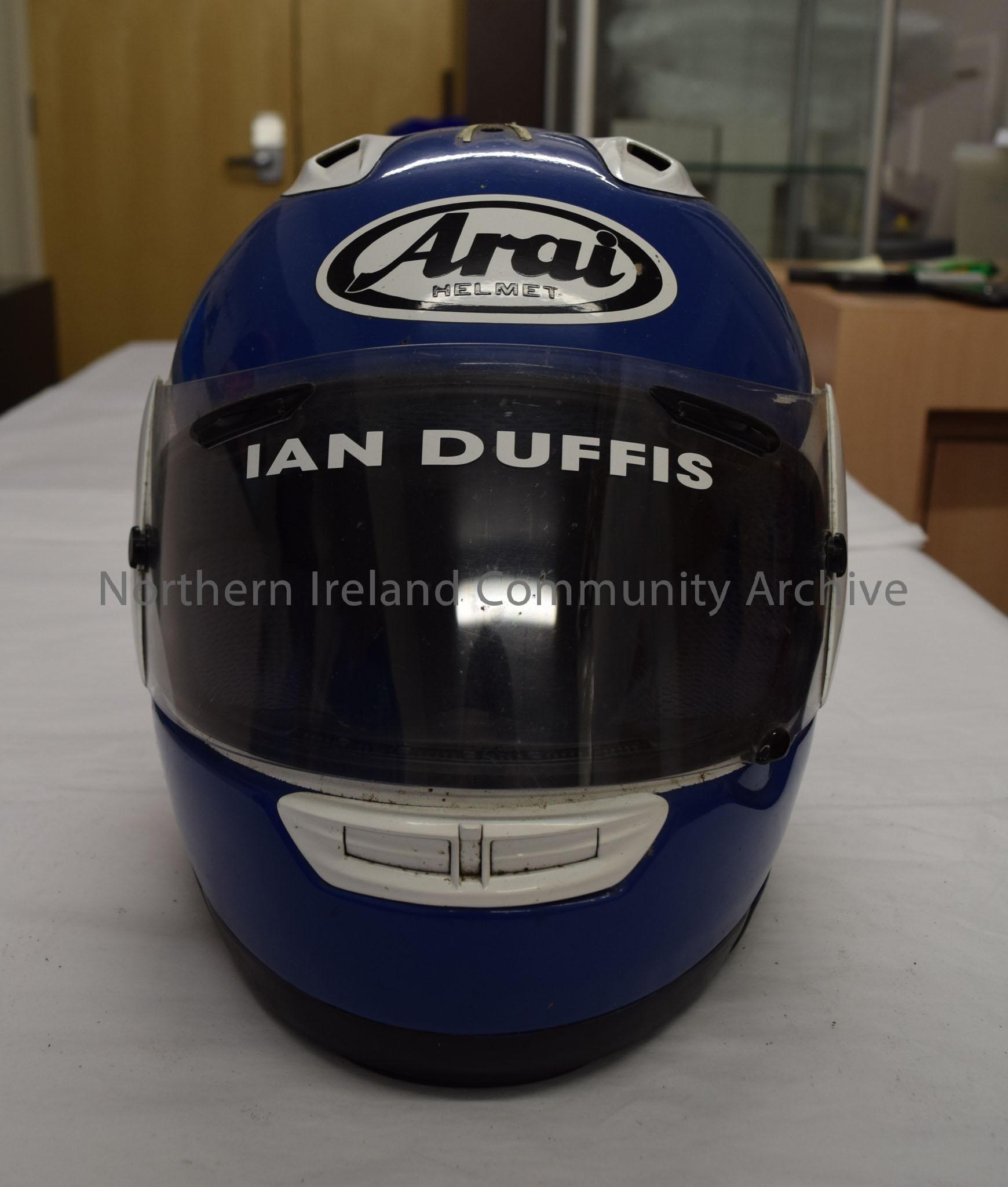 Arai motorcycle helmet belonging to Ian Duffis. Helmet with a blue front, white back and white ridges on top.