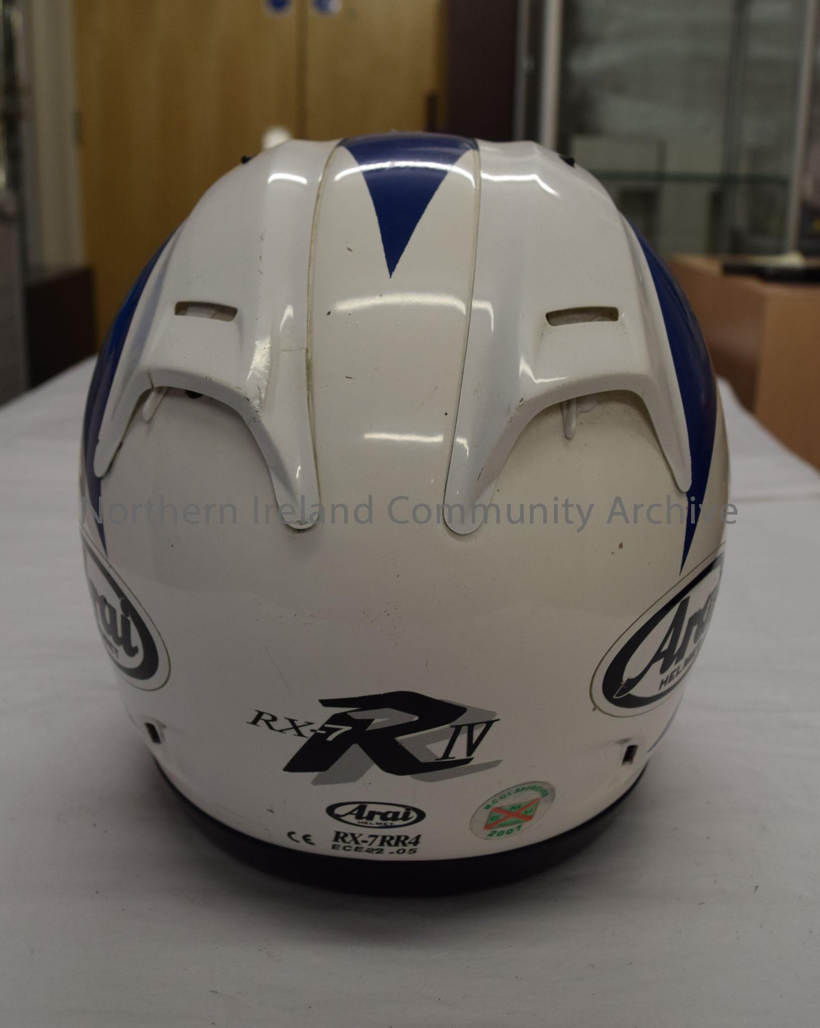 Arai motorcycle helmet belonging to Ian Duffis. Helmet with a blue front, white back and white ridges on top.