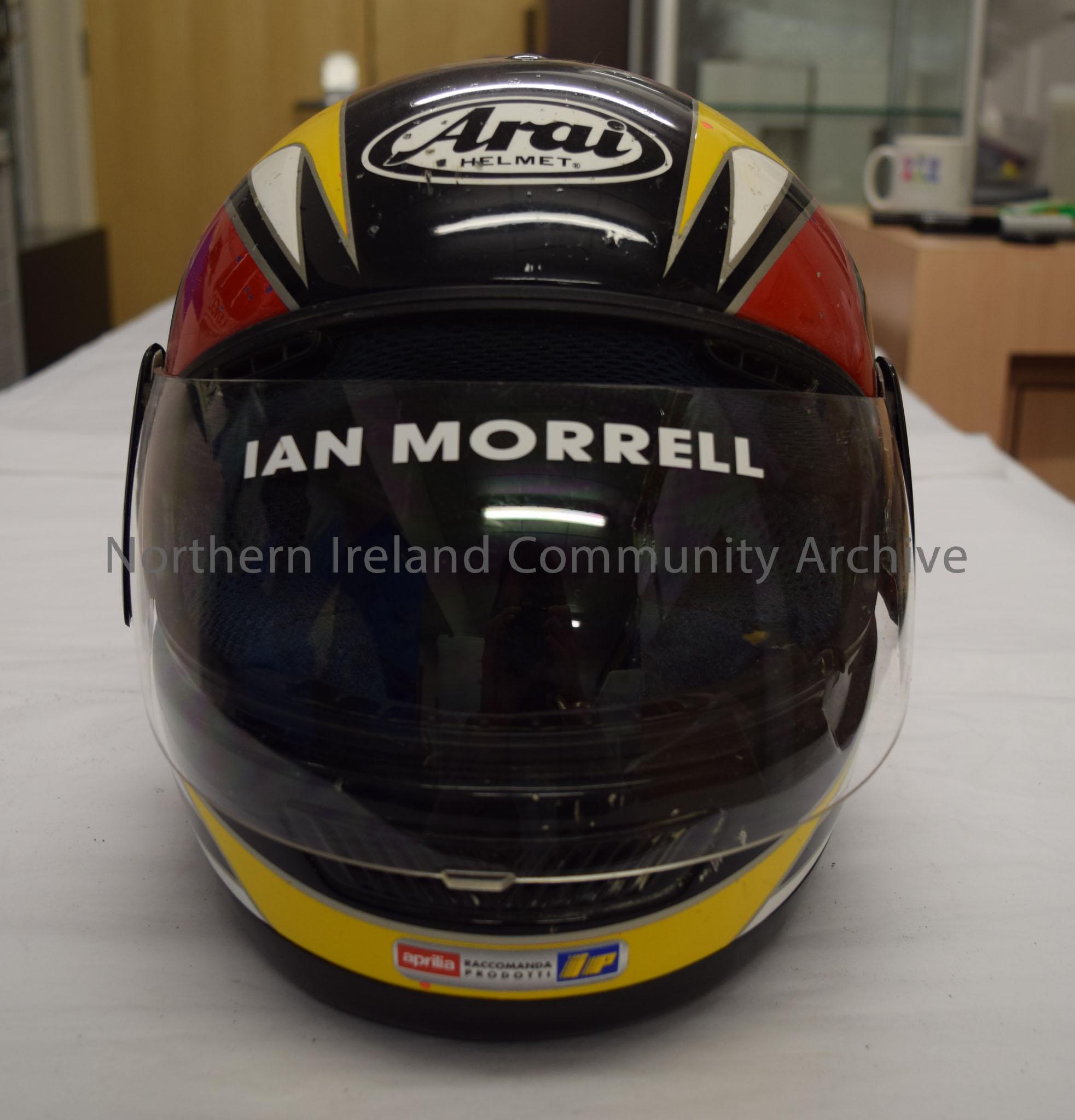 Arai motorcycle helmet belonging to Ian Morrell. Black helmet with a red, yellow and white pattern with silver trim.
