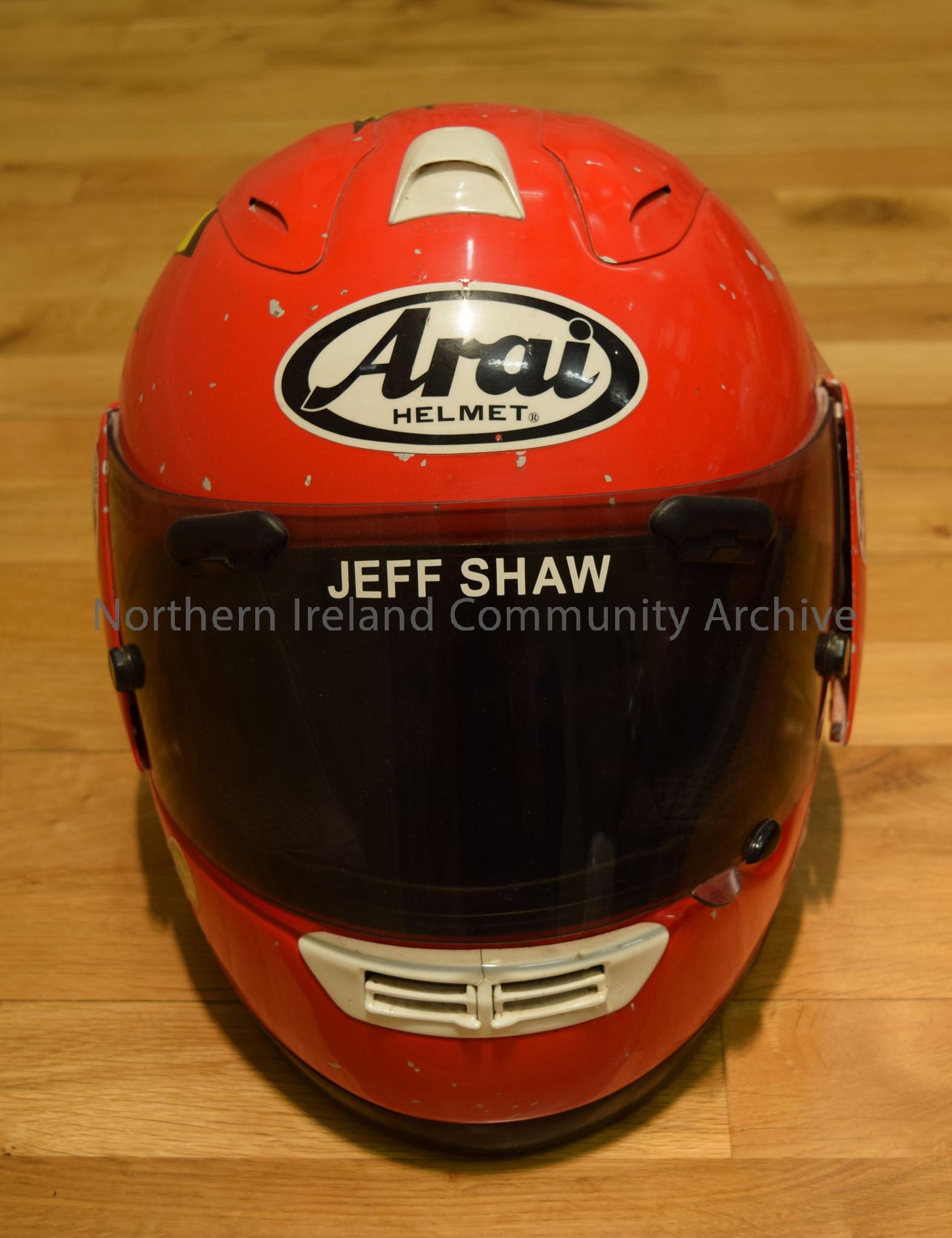 Arai motorcycle helmet belonging to Jeff Shaw. Red helmet with bright yellow back.