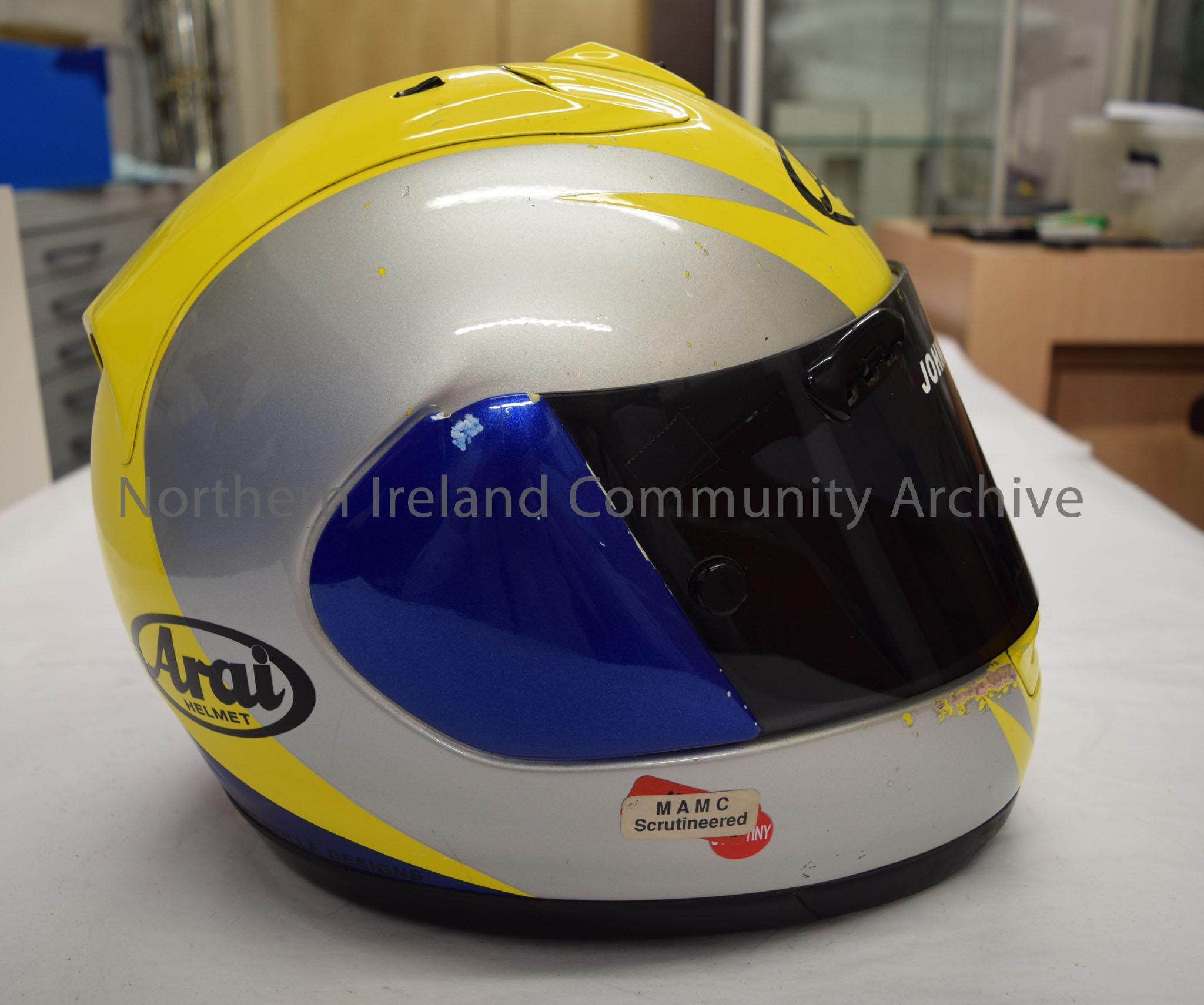Arai motorcycle helmet belonging to John Burrows. Yellow helmet with silver sides and a blue stripe running from the middle of the top to the bottom at the back
