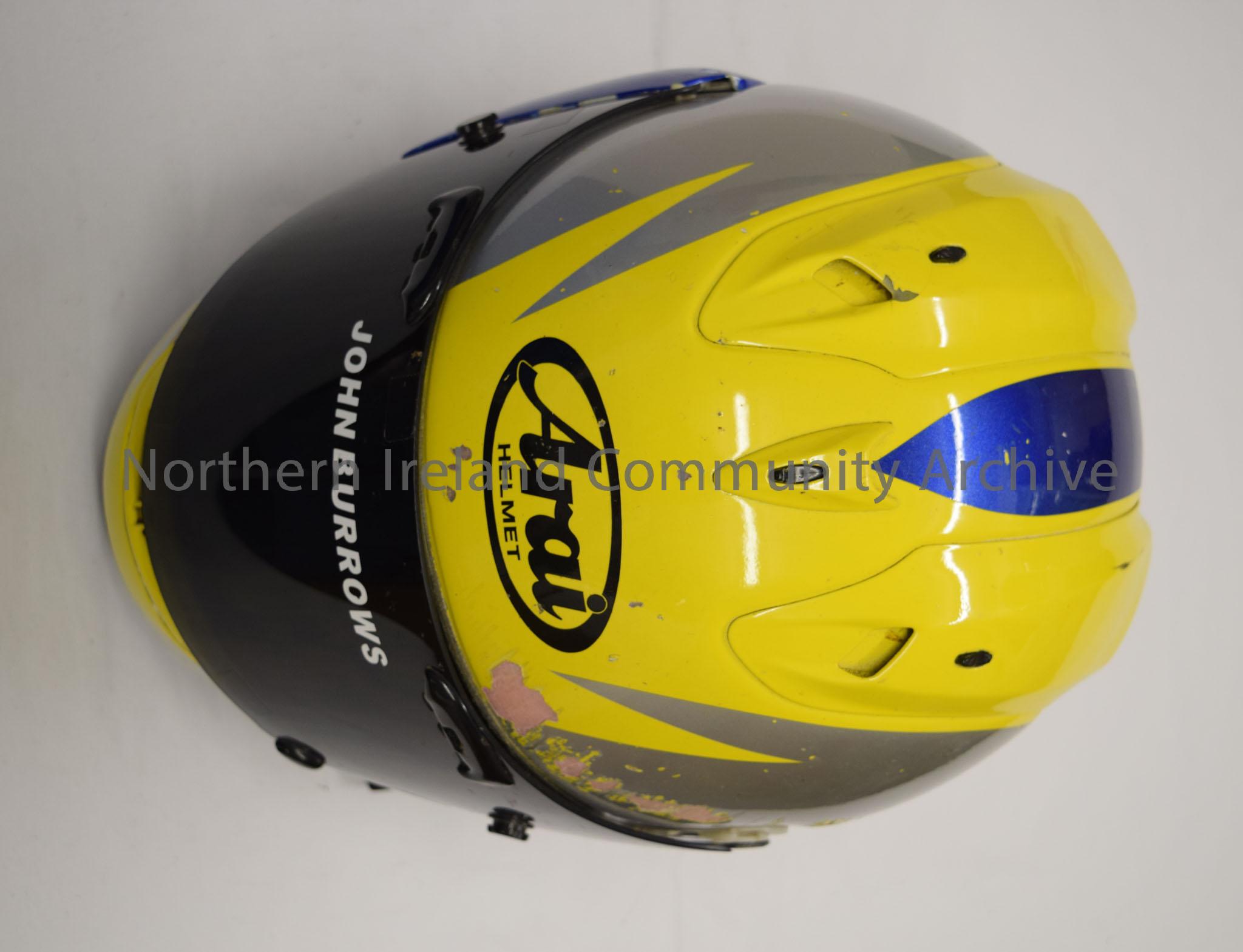 Arai motorcycle helmet belonging to John Burrows. Yellow helmet with silver sides and a blue stripe running from the middle of the top to the bottom a…