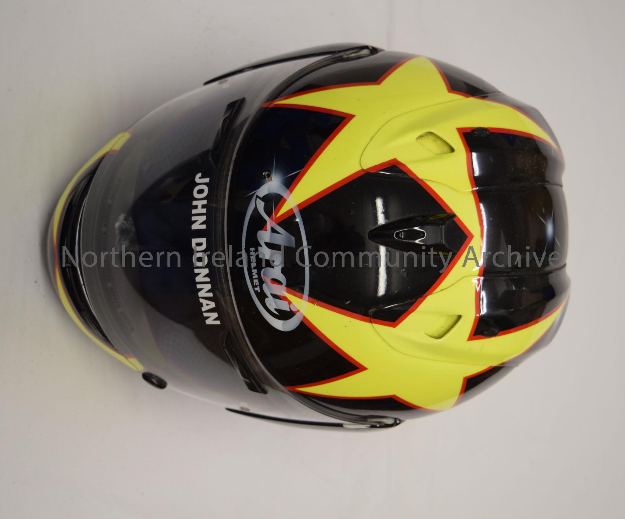 Arai motorcycle helmet belonging to John Donnan. Black helmet with yellow stars with a red border on it (two on the chin bar, two on the top and two o…