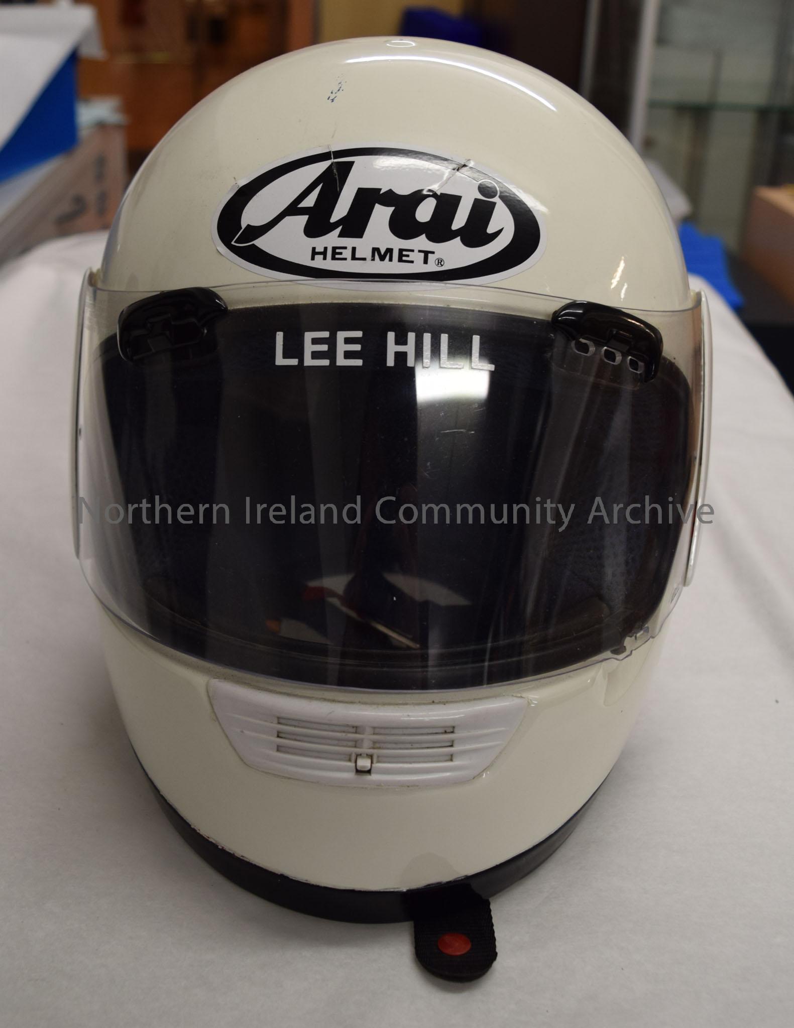 Arai motorcycle helmet belonging to Lee Hill. Plain white helmet.