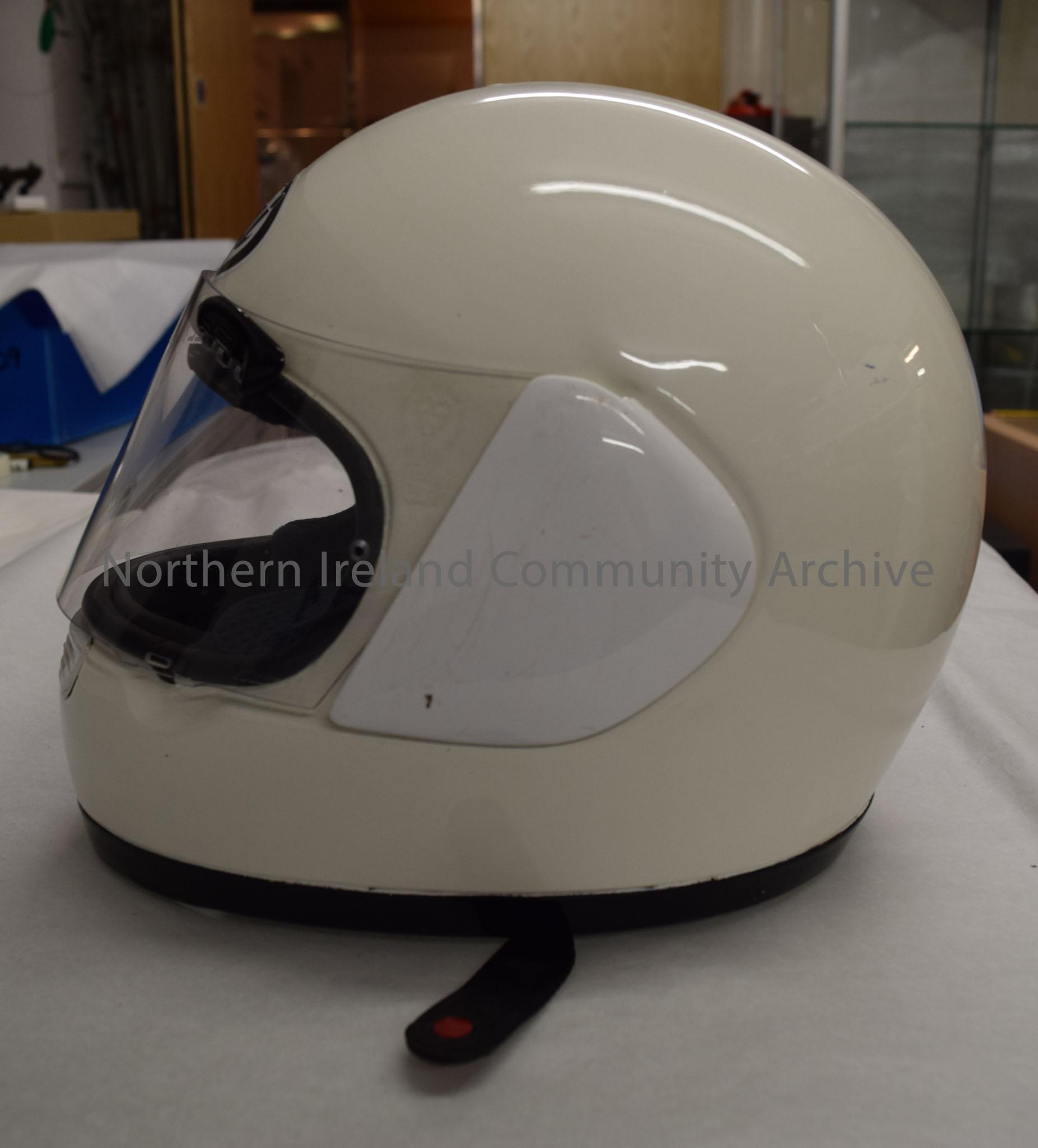 Arai motorcycle helmet belonging to Lee Hill. Plain white helmet.