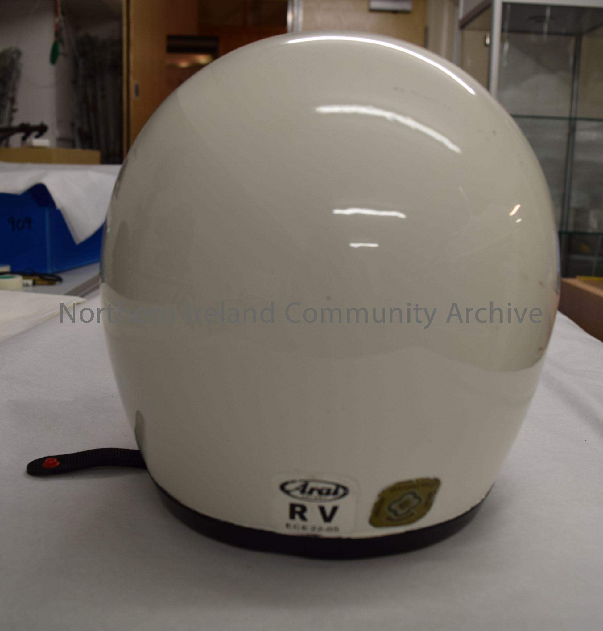 Arai motorcycle helmet belonging to Lee Hill. Plain white helmet. – 2016.48 (4)