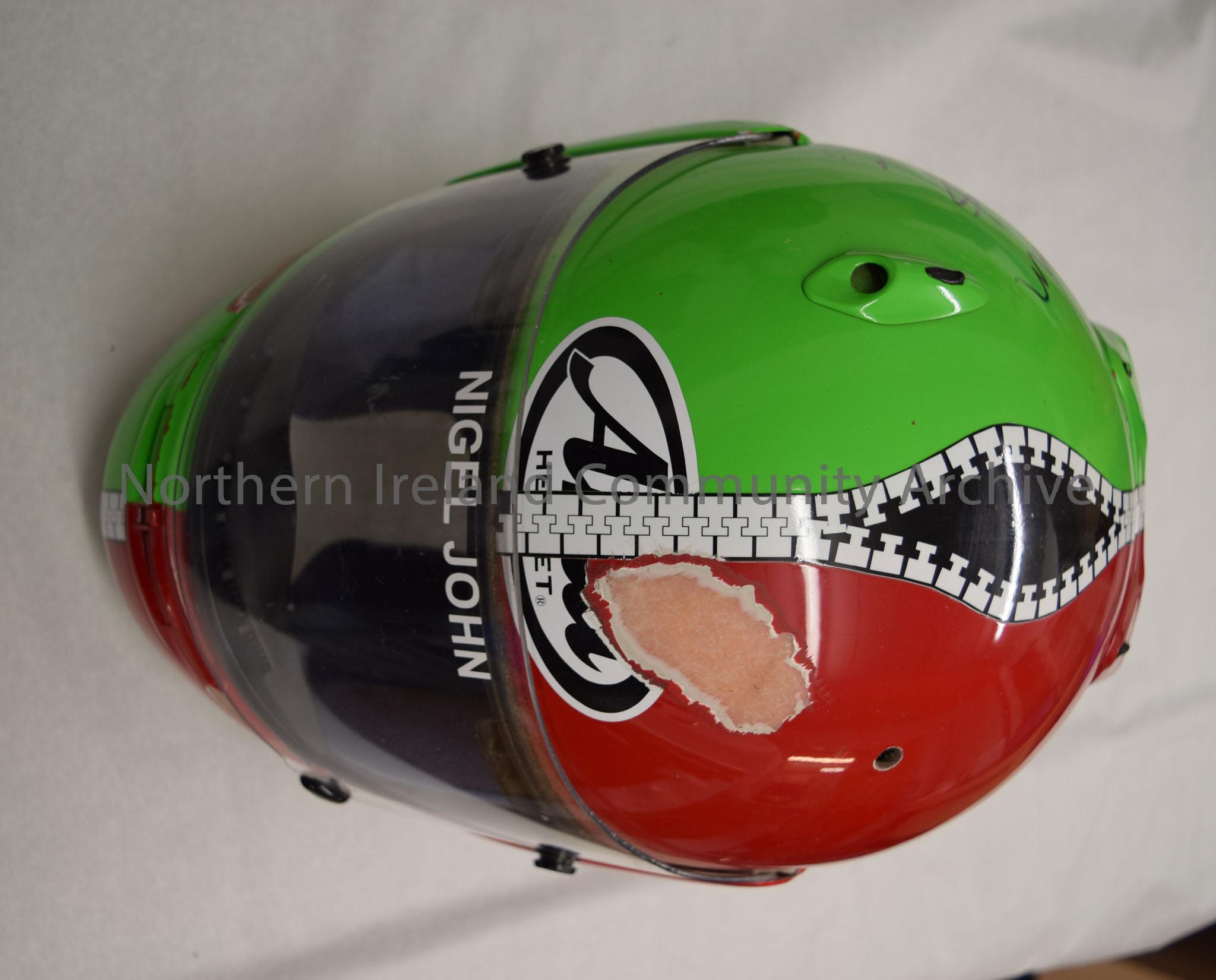 Arai motorcycle helmet belonging to Nigel John. Half red and half green helmet with an image of a zip partly open down the middle.