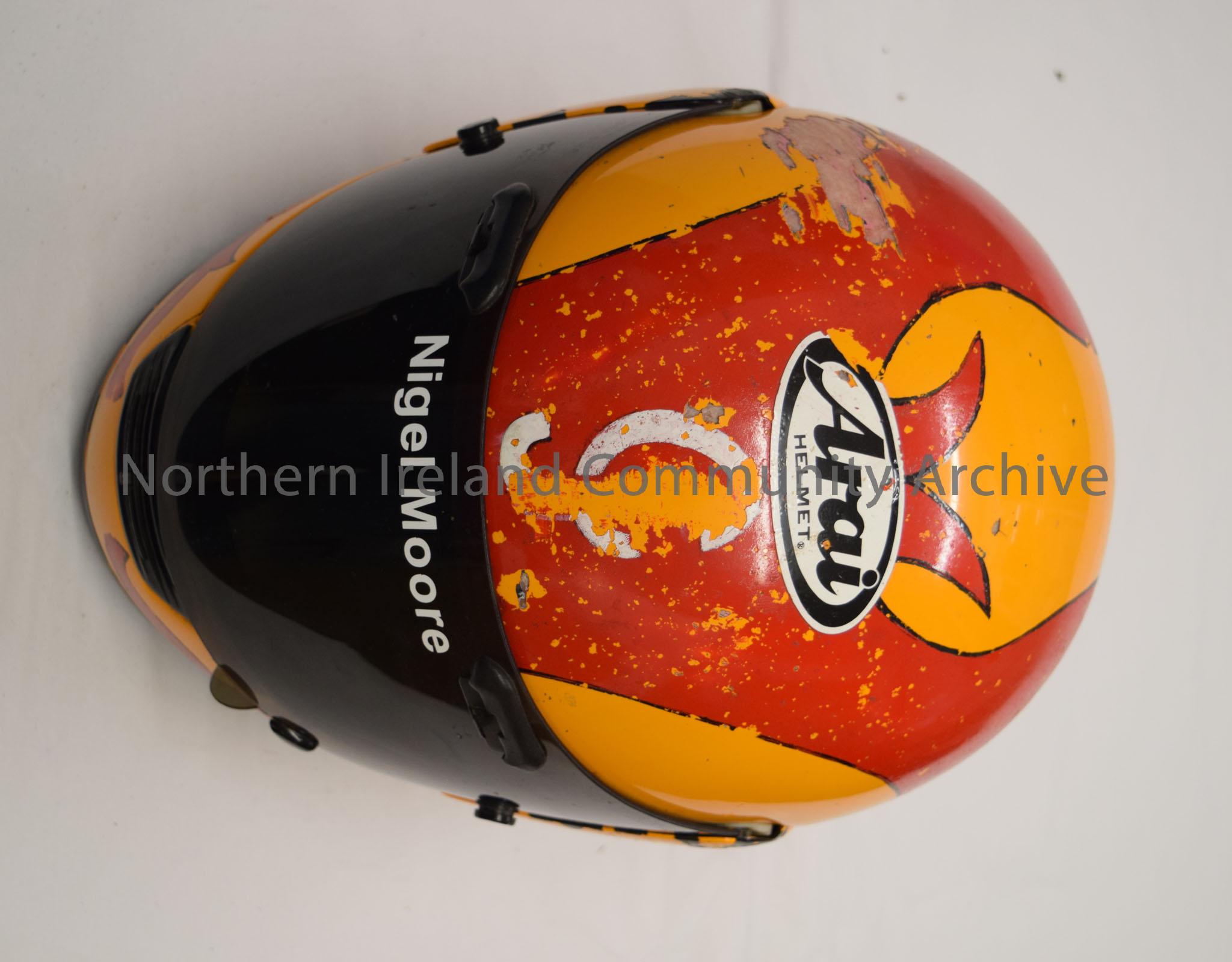 Arai motorcycle helmet belonging to Nigel Moore. Orange helmet with red pattern and black tinted visor
