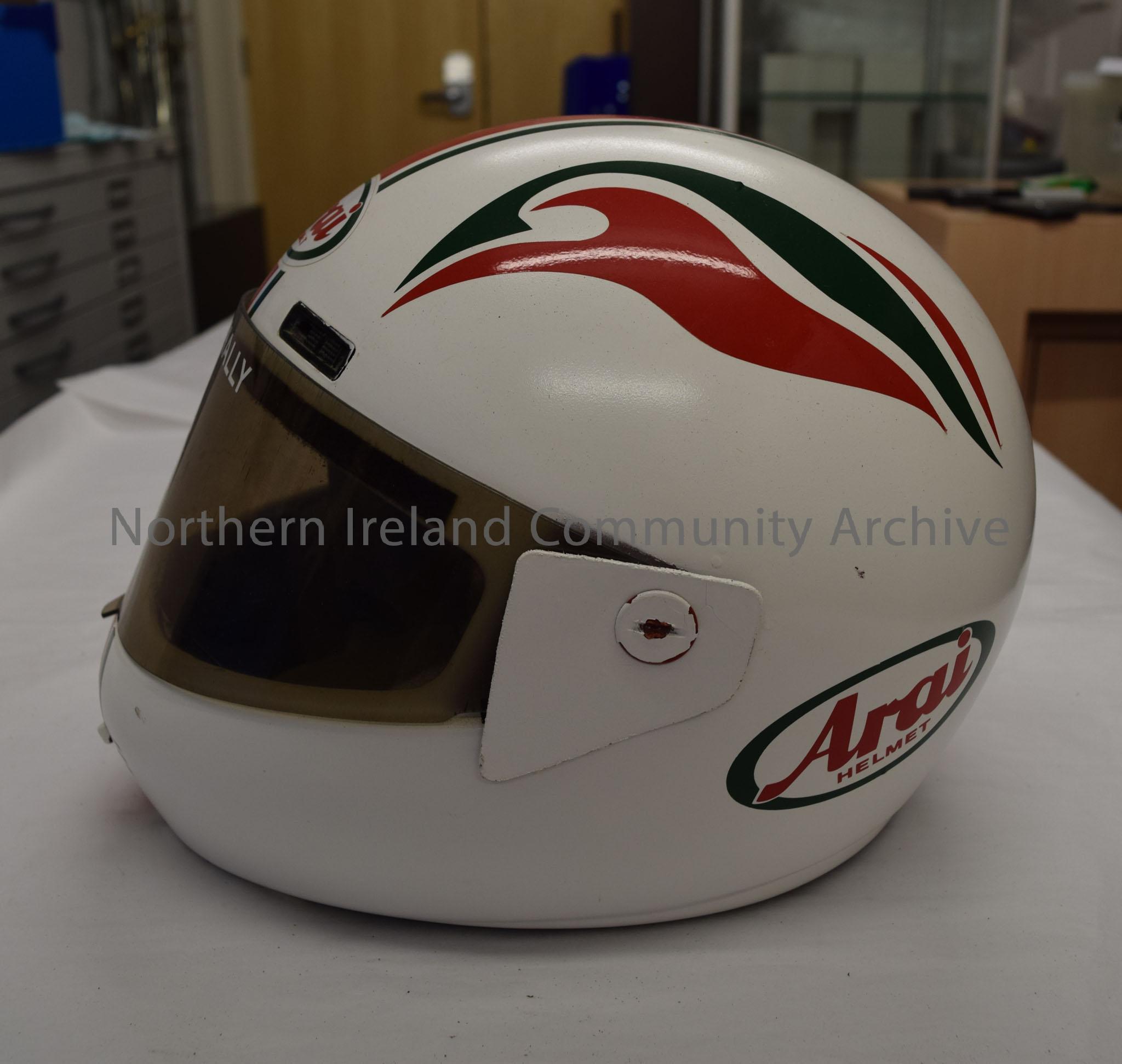 Arai motorcycle helmet belonging to Owen McNally. White helmet with red and green stripes down the middle and a red and green pattern on the sides. – 2016.82 (3)
