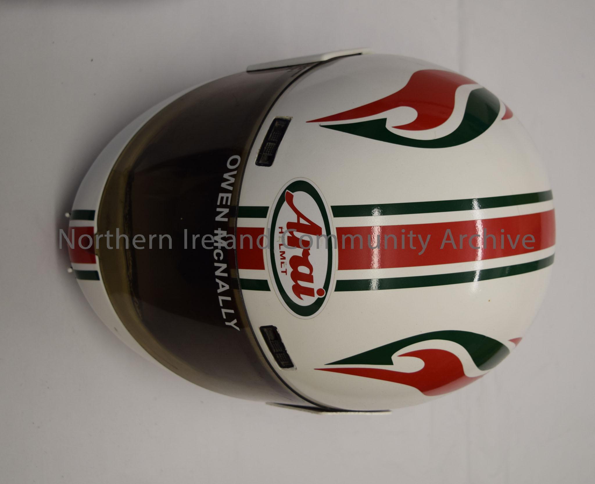 Arai motorcycle helmet belonging to Owen McNally. White helmet with red and green stripes down the middle and a red and green pattern on the sides.
