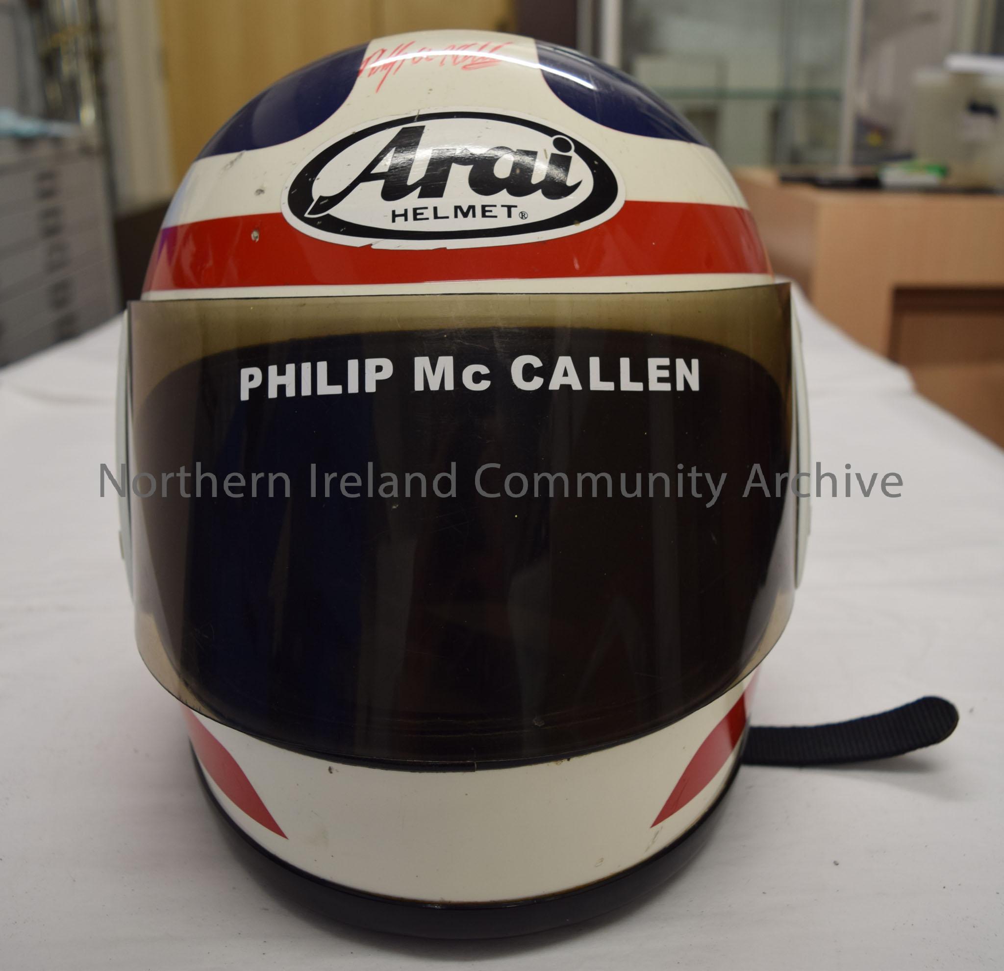 Arai motorcycle helmet belonging to Philip McCallen. White with blue and red pattern.