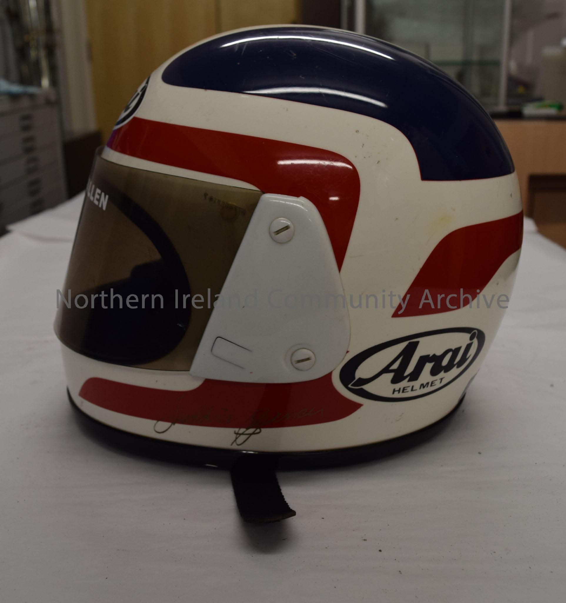 Arai motorcycle helmet belonging to Philip McCallen. White with blue and red pattern. – 2016.71 (3)